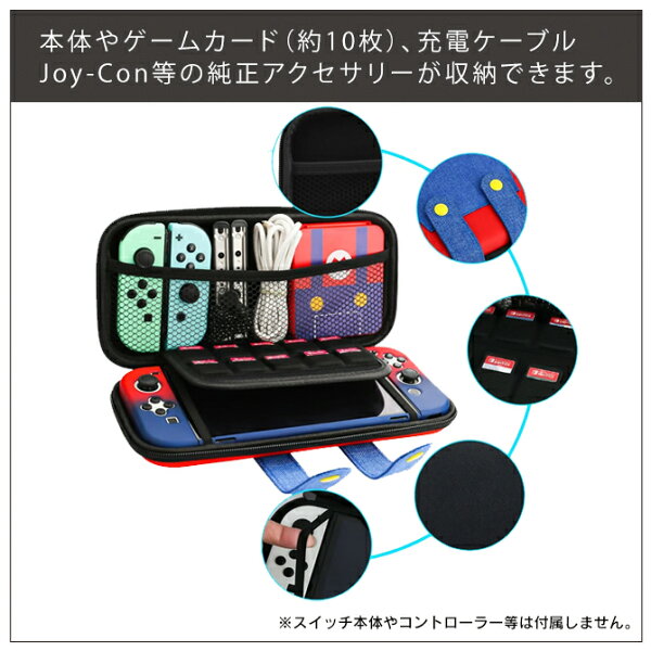 Nintendo Switch 2、Nintendo Switch / Nintendo Switch(有機ELモデル)本体やアクセサリーを収納でき、また保護するケース(カバー)です。*本体やアクセサリーを完全に保護するものではございません。おしゃれでかわいい収納ケース(収納カバー)です。本体だけでなく、ゲームカード(約10枚)、充電ケーブル、HDMIケーブル、Joy-Conストラップなどの純正アクセサリーが収納できるメッシュポケット付きです。キャリング時の衝撃や落下からSwitch本体をしっかりとカバーします。EVA、PU、オックスフォード、ビロードなどの多種類素材を利用して、Switch本体を守ります。軽量なEVA素材で防塵や防水にもなるので、トラベルグッズ、ポーチとしても活躍します。外出先でもSwitchを存分に楽しめます。