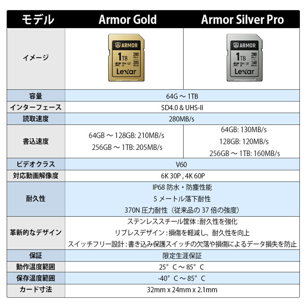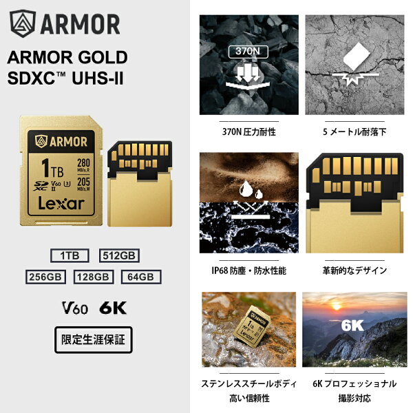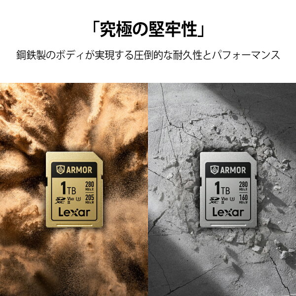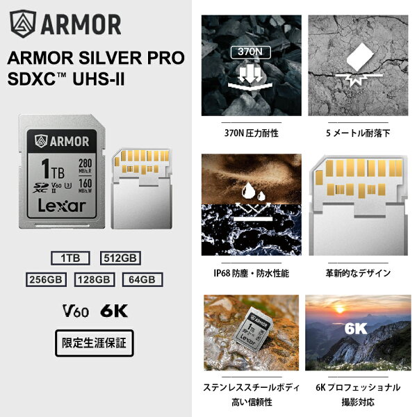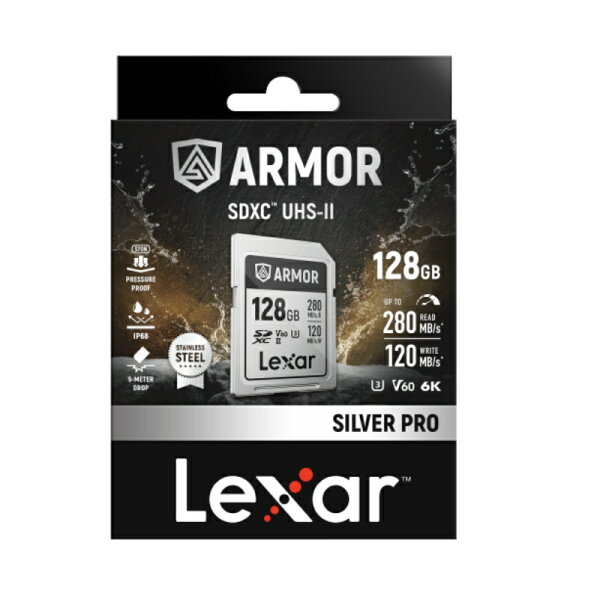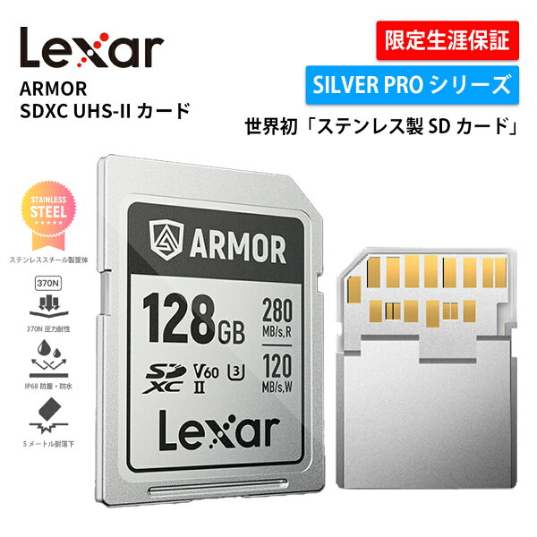 【正規代理店】Lexar ARMOR SILVER PRO SDXC UHS-II カード 128GB 256GB ステンレススチール製 SDカード V60 U3 6K 30P SDXCカード プロフェッショナル商業写真 高速連写撮影 IP68防塵 防水 優れた放熱性 370N 圧力耐性 動画撮影 cp+2025出展品 制限付き永久保証