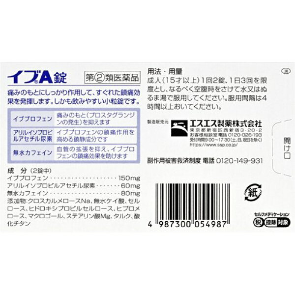 ●イブA錠は、痛み・熱にすばやくすぐれた効き目をあらわすイブプロフェンに、その鎮痛・解熱効果を高めるアリルイソプロピルアセチル尿素と無水カフェインを配合した製剤です。