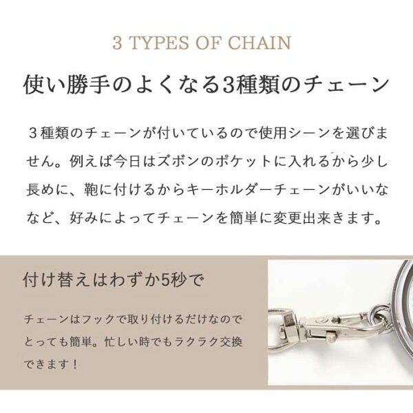 *長さが違う3種類のチェーンが付属しているので胸ポケットやズボン、バッグなどお好みに使い分けができます!