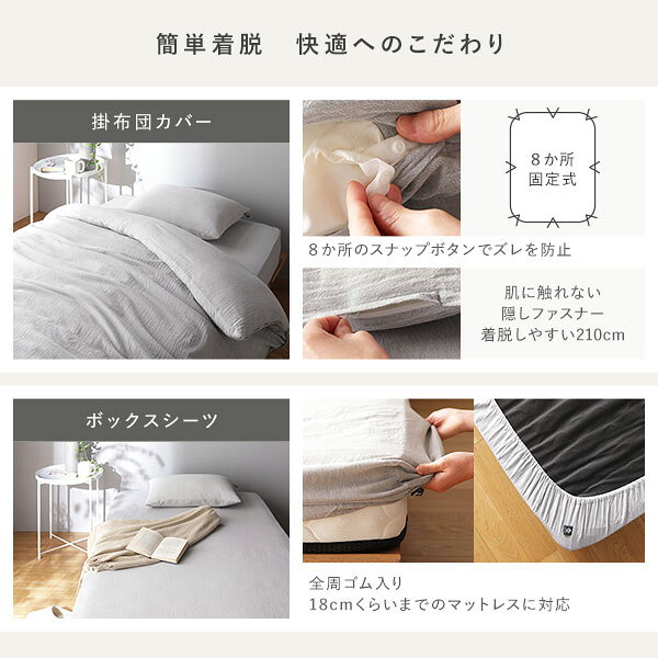 掛布団カバー:8か所スナップボタン、210cm隠しファスナー、先染め洗いざらし