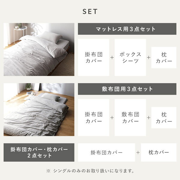 ※このページは「マットレス用3点セット(掛布団カバー+ボックスシーツ+枕カバー)」の販売ページになります。