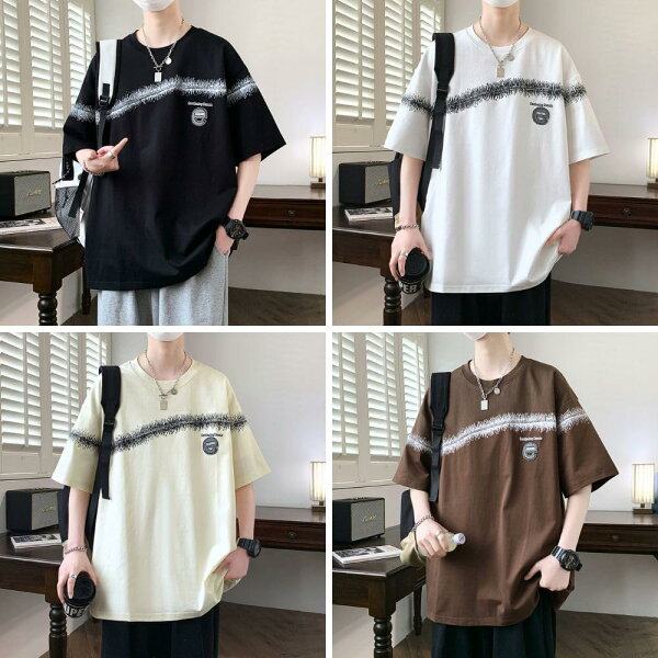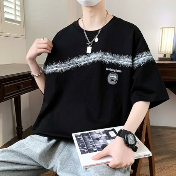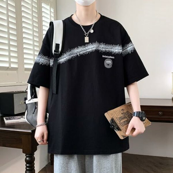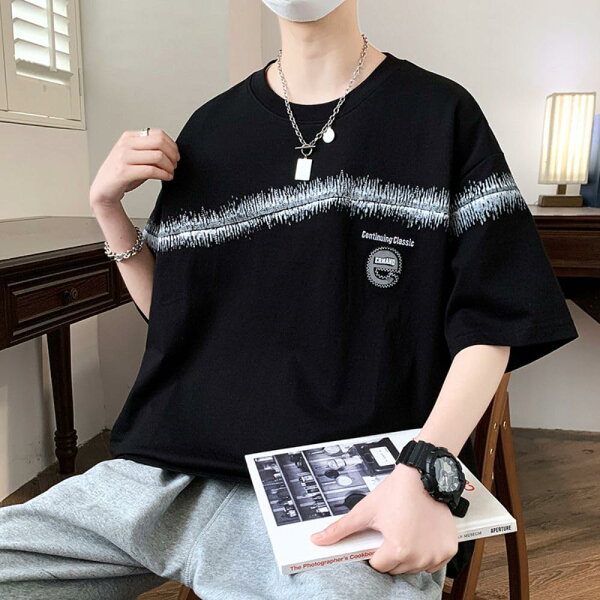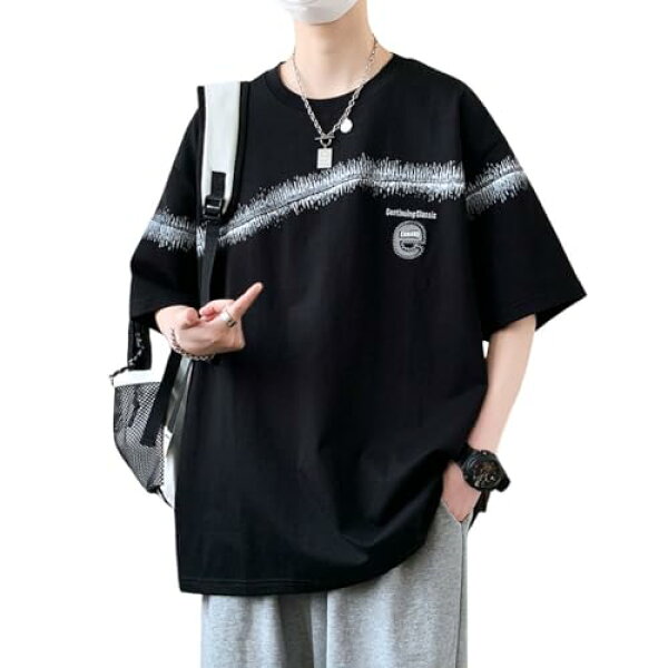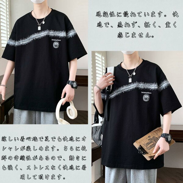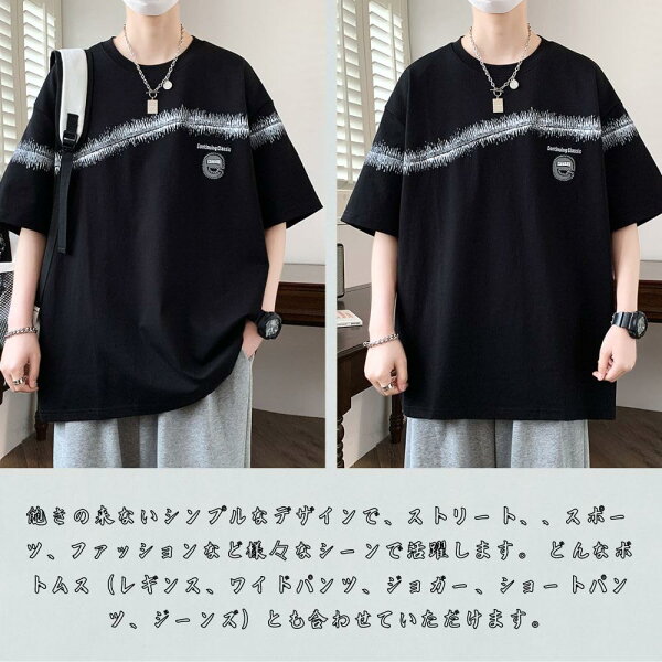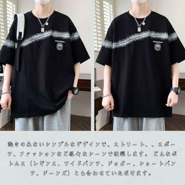 【送料無料】[PenBille] メンズ Tシャツ 夏服 tシャツ メンズ 半袖 五分袖 ゆったり 大きいサイズ かっこいい ビッグシルエット おしゃれ なつふく クルーネック プリント 人気 無地 快適 めんず ウェア 春夏秋 Black L