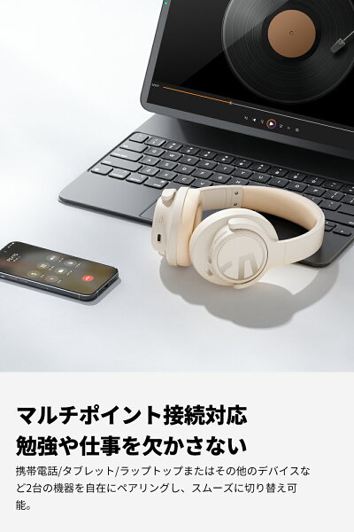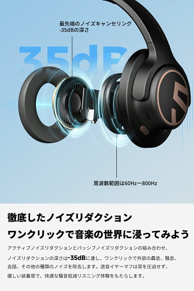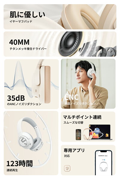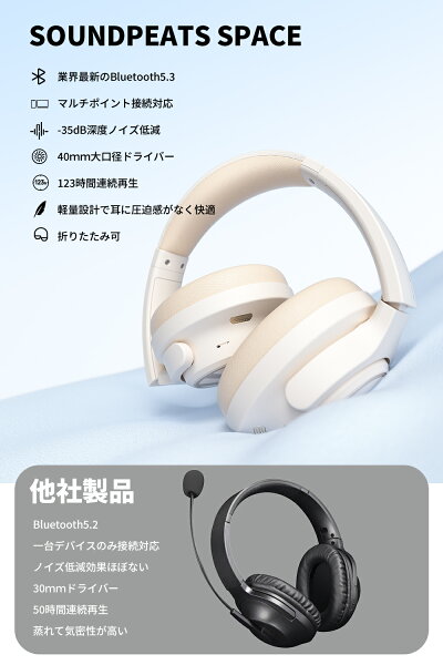 「VGP 2024金賞」【有線・無線両用】 SOUNDPEATS Space ワイヤレスヘッドホン Bluetooth 5.3 最大123時間再生 35dB ANCアクティブノイズキャンセリング 高音質40mm大口径ドライバー マルチポイント 65ms低遅延 折りたたみ 外部音取り込み ケーブル 専用アプリ対応 通気性良い