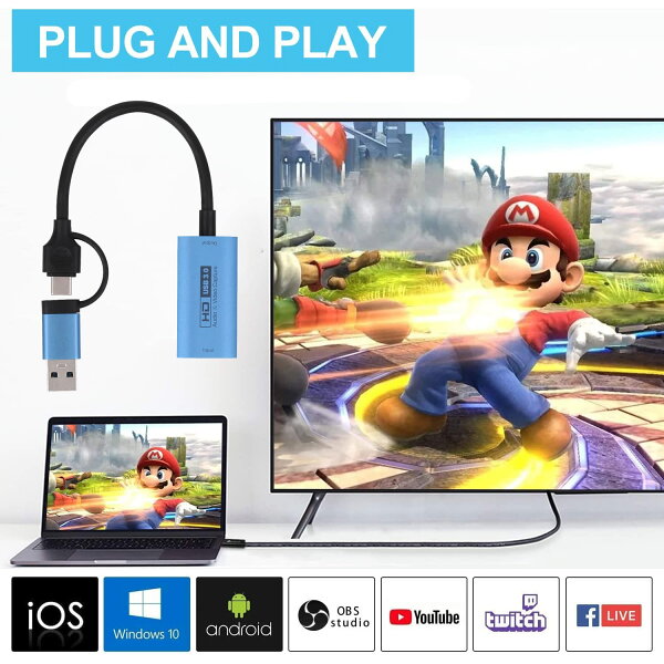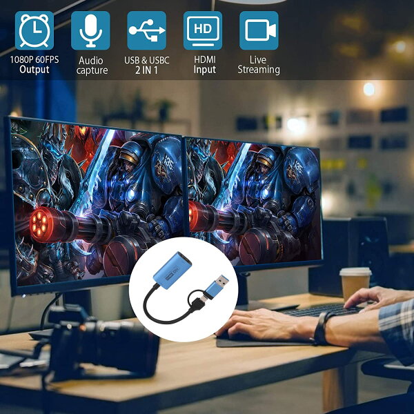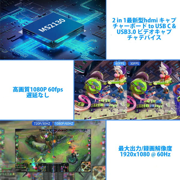 | 主な仕様 | 【HDMI - USB3.0/type c より強い互換性】この最新型hdmi キャプチャーボード to USB C & USB3.0 ビデオキャプチャデバイスは、スマホ、ゲーム機(PS4、Xbox、Switch等々)、ビデオカメラ、ラップトップ、3DSなどほとんどのデバイスと接続してビデオ/音声をPCで表示したり、高画質の録画/ライブ配信(生放送)したりすることができます。YouTube、Facebook、Twitterなどの動画配信サイトへゲーム実況動画を投稿することができます。br【1080p@60fps高解像度】 最大入力解像度は「4K(3840x2160)@ 60FPS」、最大出力/録画解像度は「1080p(1920x1080) @ 60FPS」。他のゲームキャプチャーよりもっと高画質で、Facebook、Twitch、YouTubeなどで録画、編集、配信することができます。br【USB 3.0高速伝送】HDMIキャプチャーはUSB3.0高速伝送ポート・HDMI循環に出力により、インスタントにゲームビューいし、遅延がほぼないパススルー、もっと楽にSwitch、Youtube、OBSなどゲームプレイの最高の瞬間をストリームしながら録画します。また放熱性の高いアルミ合金ケースの採用で、熱暴走などのトラブルとも無縁!長時間の配信でも安定した高画質配信を続けることが出来ます。brプラグ&プレイ、軽量小型:パソコンに差し込むだけで簡単接続、電源不要、インストールも不要です。 HDMI入力に合わせた変換ケーブルを使用することにより、幅広いデバイスと接続することが可能です。様々なアプリケーションを用いて、生配信や録画、zoom飲み会、ライブ会議等の多様な用途にお使いいただけます。brその他の特徴 :Windows、Mac、AndroidのOSに対応。VLC media player、OBS Studio、XSplitなどのライブ映像録画アプリケーションが使用できます。 |