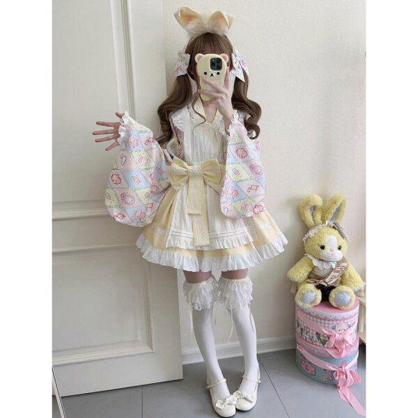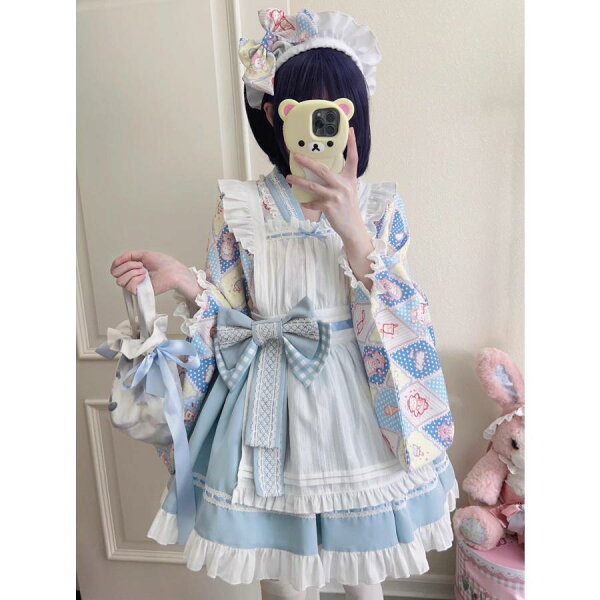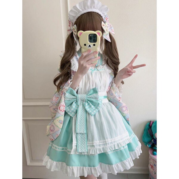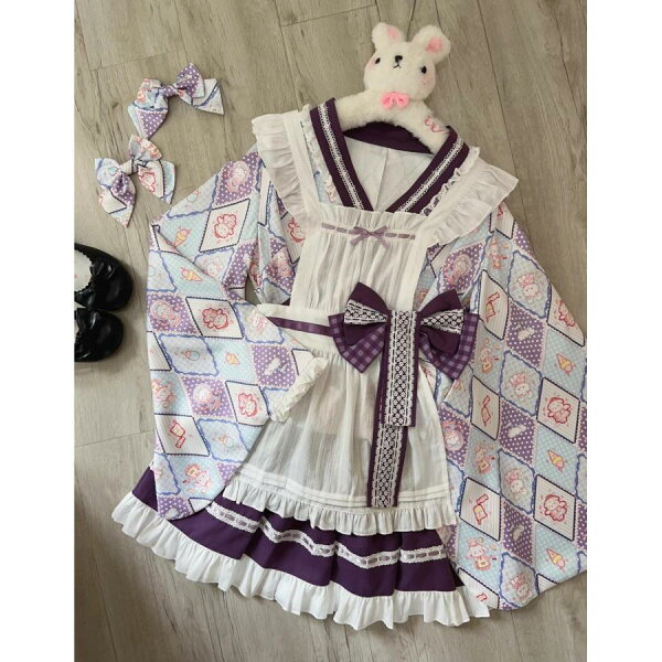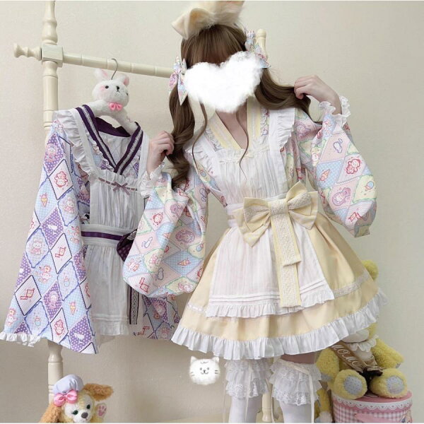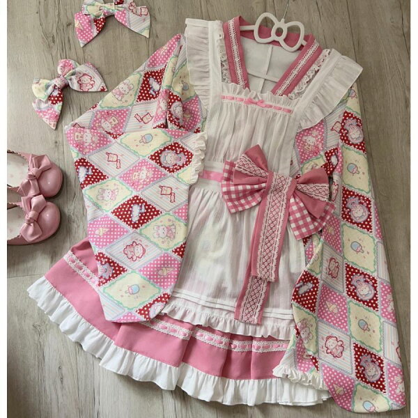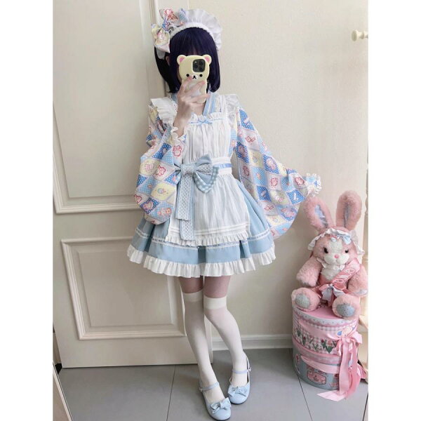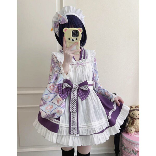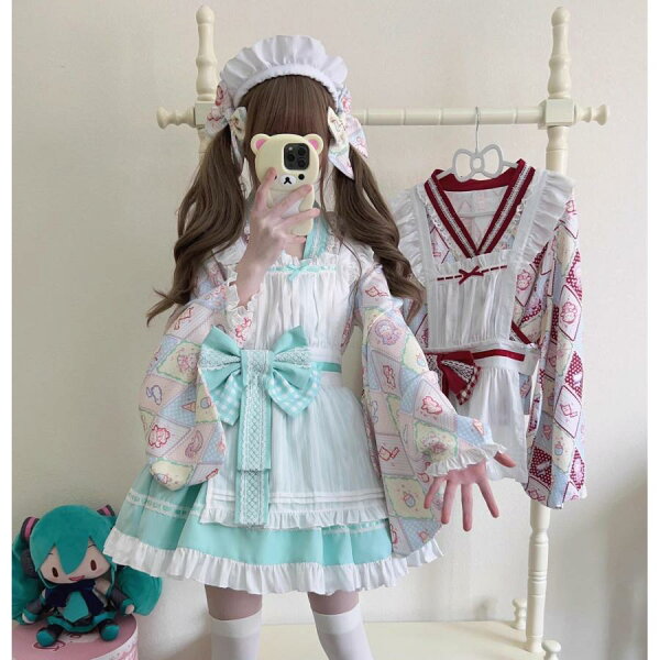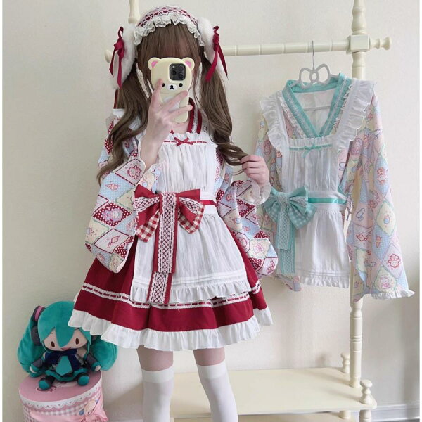 ロリータ服 改良 着物 和服 和風 メイド服 エプロン ドレス コスプレ衣装 レディース 大人 交差 留袖 ブラウス ショート丈 裾フリル スカート 腰に大きいリボン