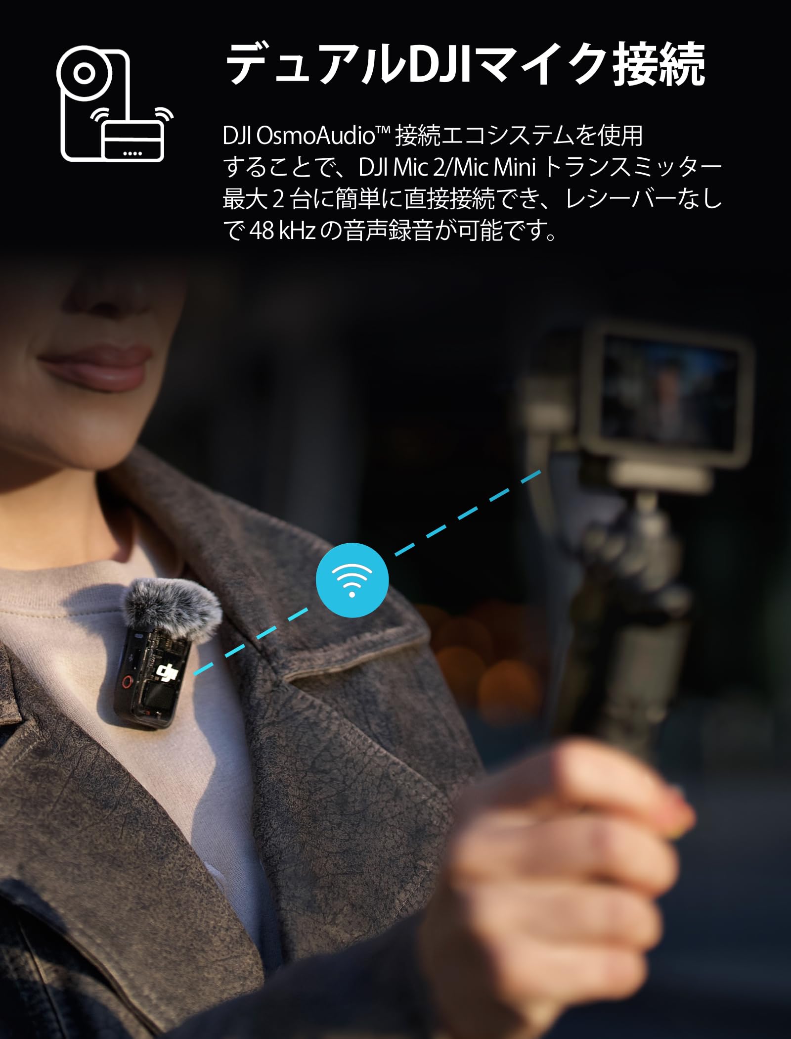 | 付属コンポーネント: | Osmo Action 5 Pro ×1, Osmo Action 5 Pro ガラスレンズカバー ×1, Osmo Action 5 Pro ゴム製レンズ プロテクター ×1, Osmo Action エクストリームバッテリーPlus(1950 mAh)×1, Osmo Action クイックリリース式アダプターマウント ×1, Osmo Action 保護フレーム(水平&垂直取り付け)×1, Osmo Action 接着式カーブベース ×1, Osmo Action 滑り止めパッド ×1, Osmo 止めねじ ×1, Type-C - Type-C PD規格対応ケーブル ×1 |