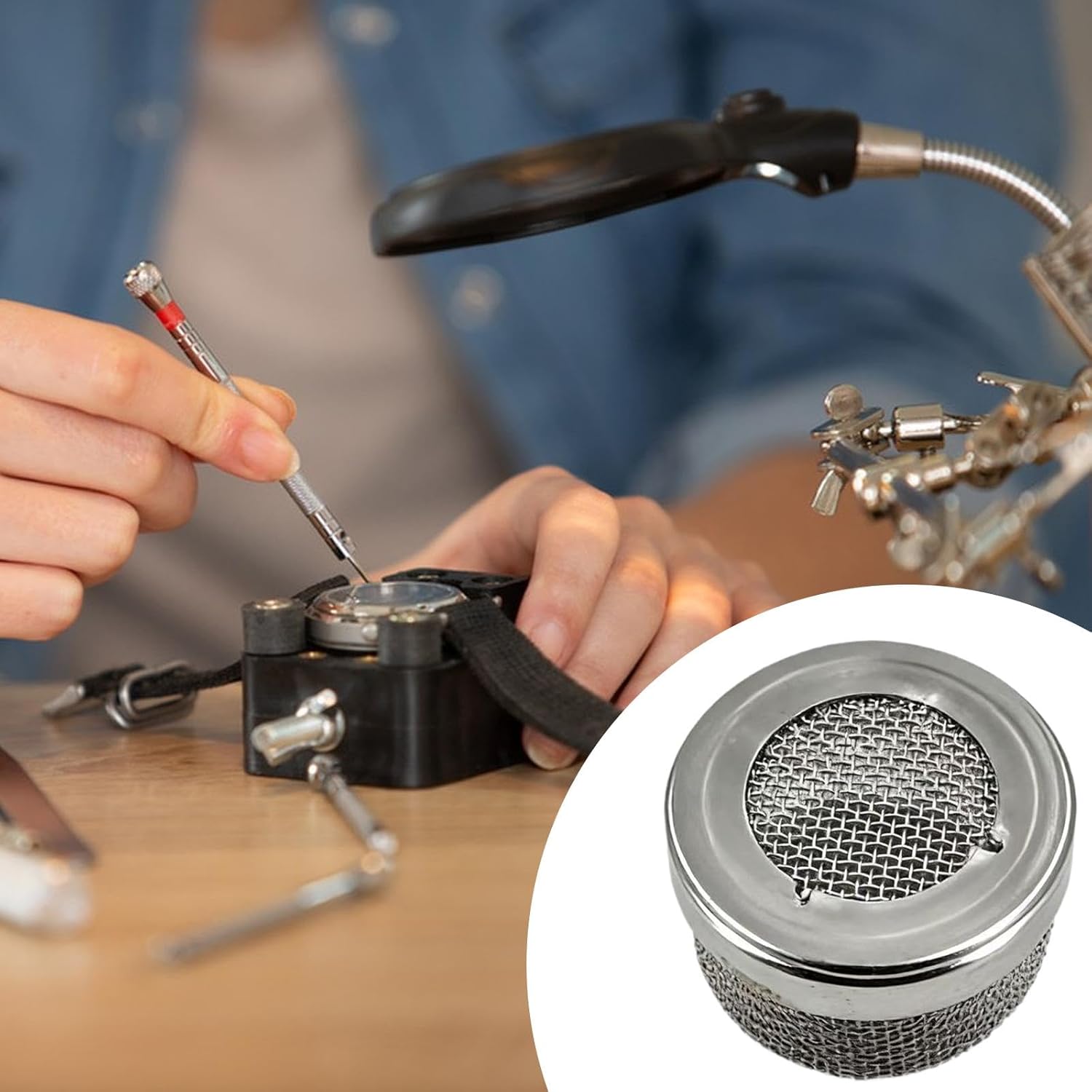 - [機能]オイル洗浄中に小さな部品やゴミを効果的に保持し、時計のメンテナンスルーチンの効率と清潔さを向上させます。