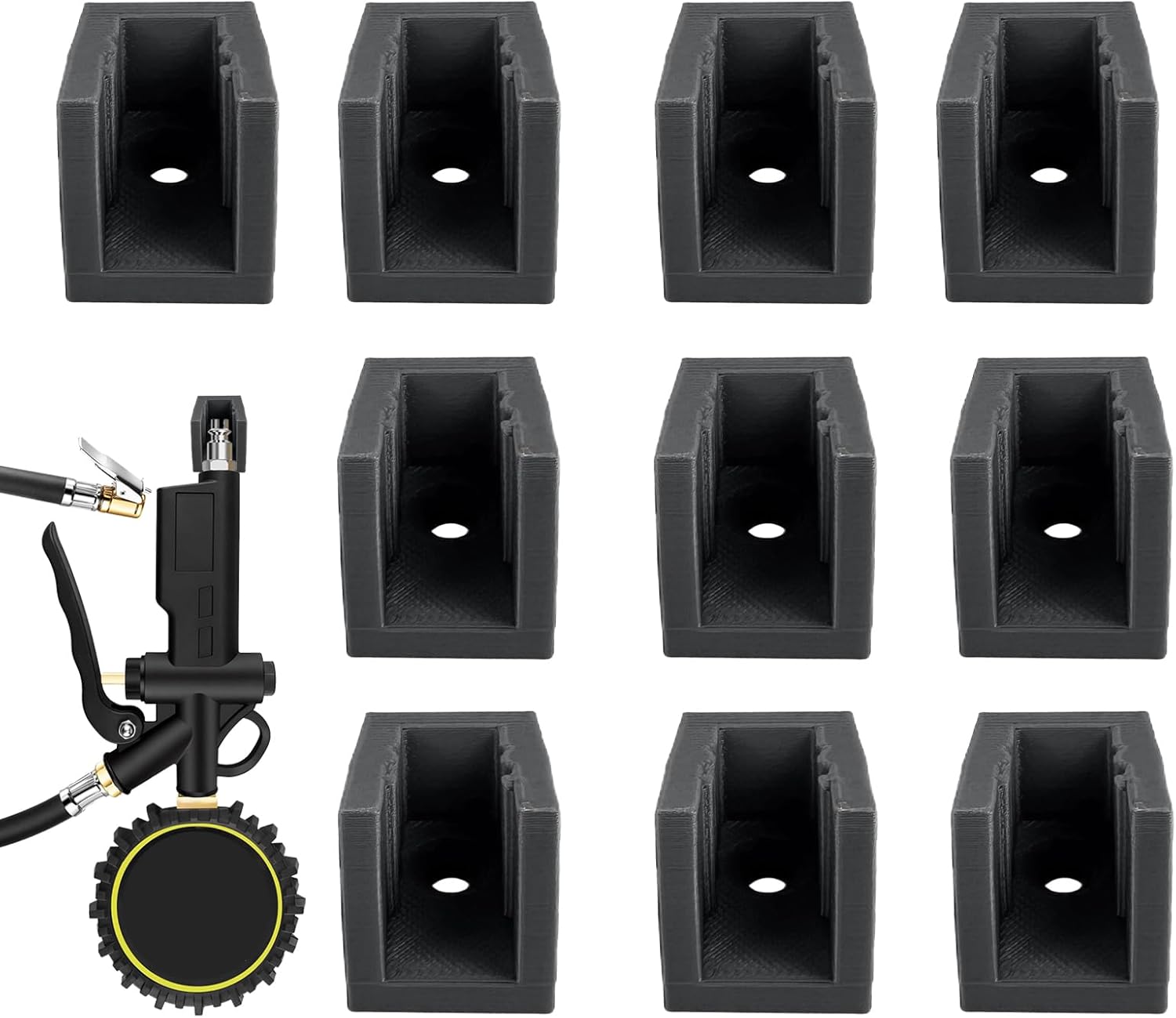 エアツールウォールホルダーは、最大 10 個のツールを効率的に整理して保管できるように設計されています。専用のタイヤ空気圧計オーガナイザーを備えたこのハンガーは、ガレージや作業場のスペースを最大限に活用します。自動車修理作業、洗車ステーション、メンテナンスエリアに最適で、狭いスペースをすっきりと保ちながら、必要なときに工具に簡単にアクセスできるようにします。