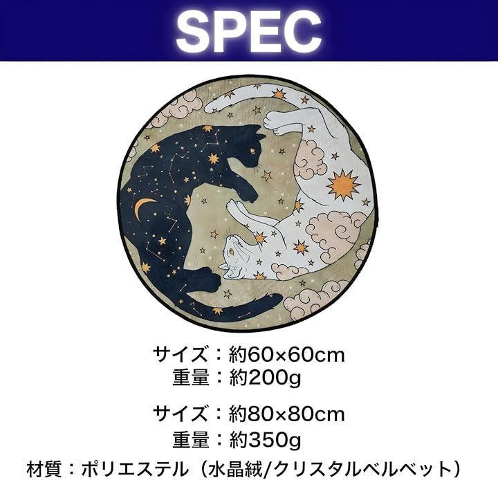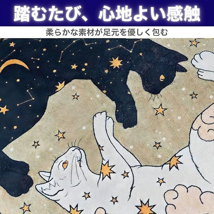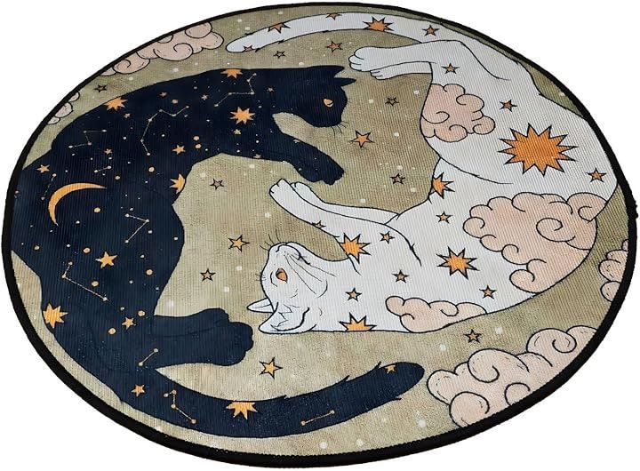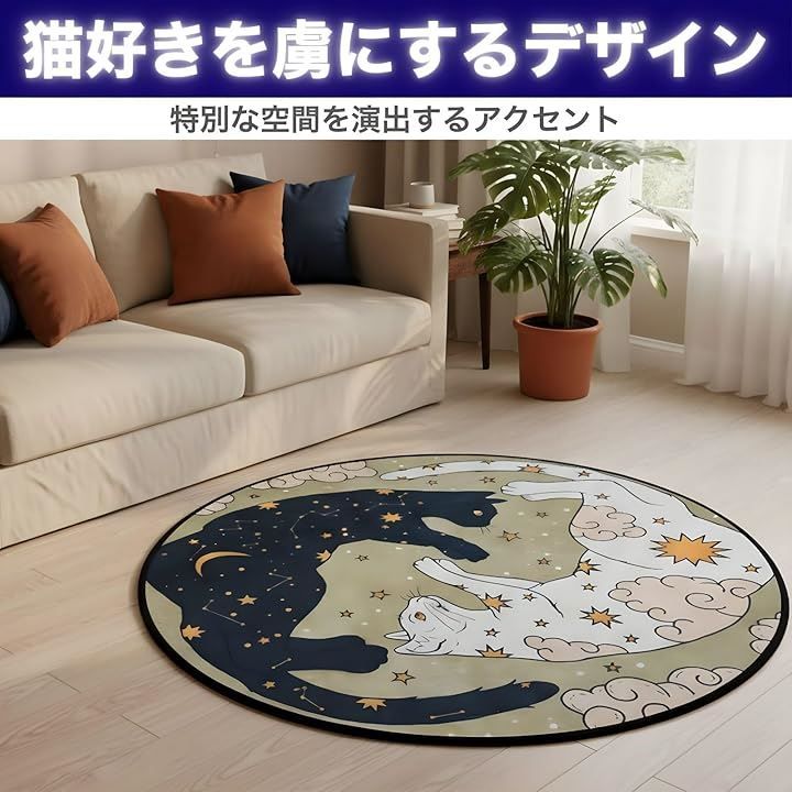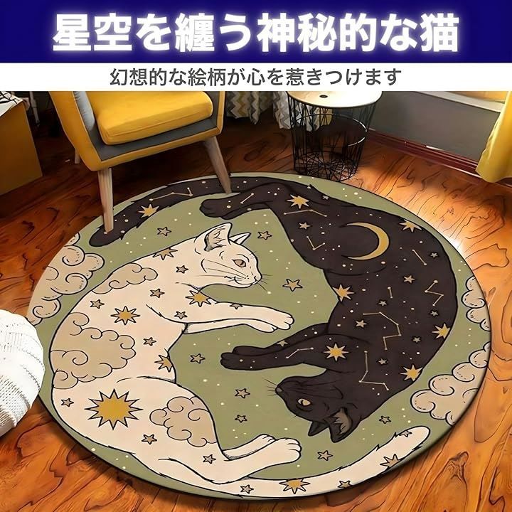 「猫 ラグ 円形」は、まるで夜空に浮かぶ魔法陣のような、ユニークな絵柄の円形ラグマットです。