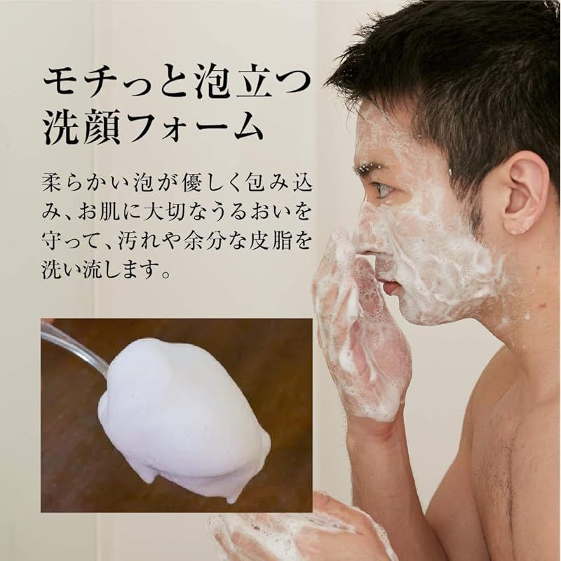 【 つっぱらないモチっと泡立つ洗顔フォーム 】柔らかい泡が優しく包み込み、お肌に大切なうるおいを守って、汚れや余分な皮脂を洗い流し、素肌を清潔にする男性用洗顔クリーム。 シェービングの際にもお使いいただけます。