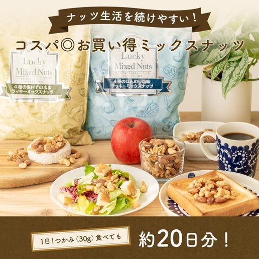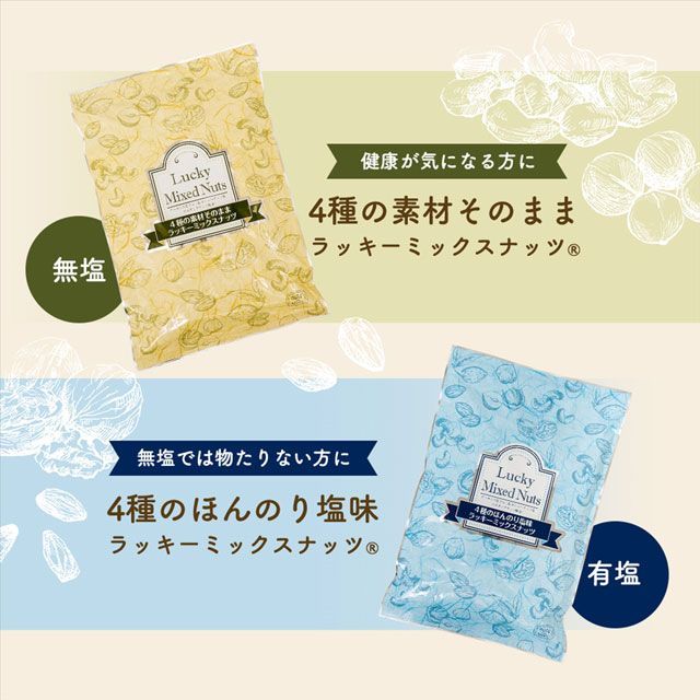 【大切なお知らせ:3種・4種のラッキーミックスナッツ 内容量変更のご案内】 平素より弊社商品をご愛顧いただき、誠にありがとうございます。 このたび「3種・4種のラッキーミックスナッツ(700g)」につきまして、内容量を700gから600gへ変更させていただく運びとなりました。 お客様には突然のお知らせとなりますこと、心よりお詫び申し上げます。 昨今、ナッツ類の原材料価格をはじめ、物流コストや包装資材費の高騰が長期化しており、製造コスト全体が大幅に上昇しております。 弊社ではこれまで、段階的な価格改定を行いながらも、お客様のご負担を可能な限り抑えられるよう努め、商品の安定供給を続けてまいりました。 今後も安心してお手に取っていただける価格帯を維持するため、今回は価格を据え置きつつ、内容量を見直す判断をさせていただきました。 ■ 変更内容 変更前:700g  変更後:600g 適用時期 2025年7月17日購入分より順次切替 ※ナッツの種類や配合比率、品質には一切変更はございません。 ※2025年7月16日(水)23:59までのご注文分につきましては、従来どおり700gの商品をお届けいたします。  それ以降のご注文分につきましては、順次600gへと切替となります。 今後も、お客様に安心してお選びいただける商品づくりに努めてまいります。 引き続き「ラッキーミックスナッツ」をご愛顧賜りますよう、心よりお願い申し上げます。 【土日祝日を除く3~4日以内に出荷】 ▼ 無塩・有塩が選べる ラッキーミックスナッツ600g ▼ 健康志向の方には無塩タイプ、おつまみにぴったりな有塩タイプがお好きに選べます! 高級ナッツである、素煎りアーモンドとクルミ、カシューナッツ、マカダミアナッツを贅沢に絶妙なバランスで仕上げたミックスナッツです。この道のプロが「飽き」がこない絶妙なバランス配合を考えた逸品です。 【名称】ミックスナッツ 【原材料名】 無塩:アーモンド、くるみ、カシューナッツ、マカダミアナッツ 有塩:アーモンド、くるみ、カシューナッツ、マカダミアナッツ、食塩 【原産国】 ・くるみ (アメリカ) ・マカダミアナッツ (オーストラリア、ケニア、マラウイ、南アフリカ) ・アーモンド (アメリカ) ・カシューナッツ (インド、ケニア、タンザニア、ベトナム) 【内容量】600g 【賞味期限】製造日より約185日 ※出荷日より賞味期限まで90日以上の商品をお届けします。 【保存方法】直射日光、高温・多湿を避け、常温で保存下さい。 【無塩:加工者、有塩:製造者】 有限会社 味源(美味しさは元気の源 自然の館) TEL:0877-75-3181 【お召し上がり方】そのままお召し上がりください。お子様のおやつとして、お酒のおつまみとしても最適です。 【ご注意】 ・使用しているアーモンドは粒の形が長く扁平な外観が特徴でございます。味が淡白で食感が柔らかいため湿気たように感じる場合がございますが、アーモンドの品種によるもので、品質には問題ございませんのでご安心ください。 ・くるみに黒いシミがある場合がございますが、くるみの渋皮が日に焼けて黒くなる現象です。商品内に入っている細かい粉は、クルミなどの渋皮によるものです。品質等に問題はございません。 ・原料は選別しておりますが、除去しきれないくるみの殻が残っている場合があります。 召し上がりの際は十分ご注意ください。 ・マカダミアナッツはハーフカットになります。 ・ナッツは農産物の為、粒の大きさや食感、水分含有量、色調等に個体差があります。 また天候による温度変化も影響する為、焙煎度合いを均一にすることが大変難しい商品でございます。 自然由来の食品につき何卒ご了承ください。 ・当工場では、小麦、そば、卵、乳成分、落花生、エビ、カニを含む製品を製造しています。 【お届け方法】ネコポス配送 2~3営業日以内に出荷いたします。 出荷日から2~3日前後でのお届けになります。 ポスト投函/日時指定不可 こちらの商品は簡易包装のため訳ありです。