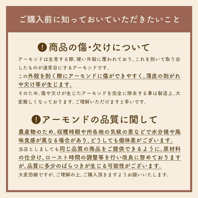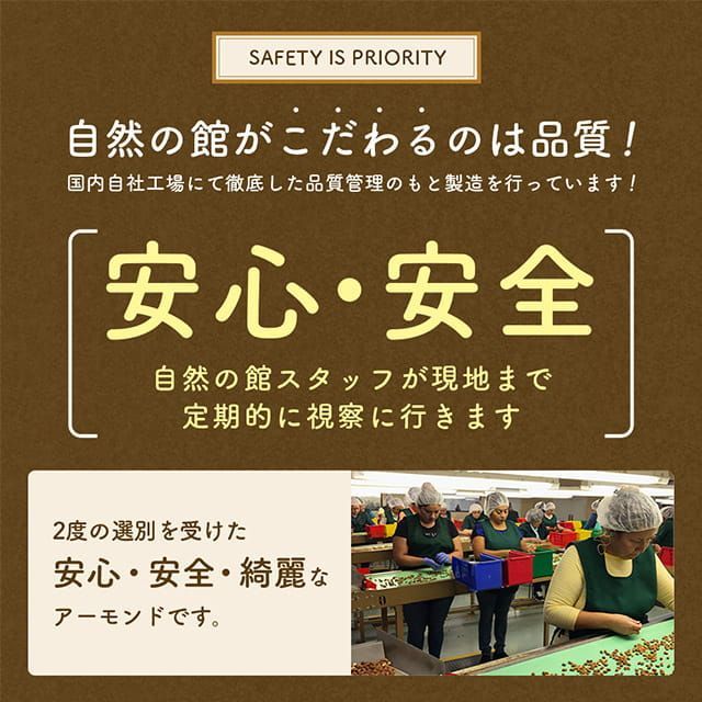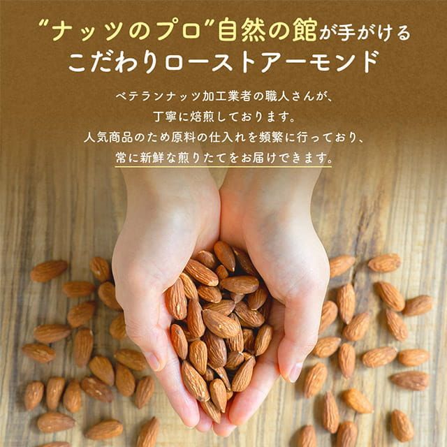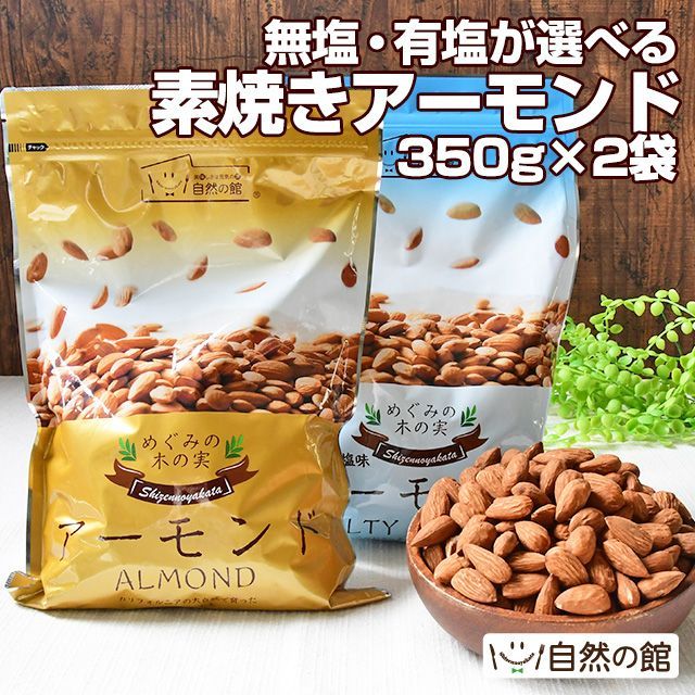 【土日祝日を除く3~4日以内に出荷】 ▼ 無塩・有塩 選べる 素焼きアーモンド ▼ 健康志向の方には無塩タイプ、おつまみにぴったりな有塩タイプがお好きに選べます! カリッと香ばしい歯ごたえ!ベテラン職人さんが丁寧に焙煎しております。鮮度が良い煎りたてをお届け! アーモンドは様々な栄養素や良質な油を含んだ天然サプリ!1日約23粒(手のひらに軽く1杯分)が目安です。 アーモンドで健康生活始めませんか? 【名称】木の実 【原材料名】 無塩:アーモンド 有塩:アーモンド、食塩 【原産国】アメリカ 【内容量】350g×2袋(合計700g) 【賞味期限】製造日より約185日 【保存方法】直射日光、高温・多湿を避けて、常温で保存下さい。 無塩:加工者 有塩:製造者 有限会社 味源 (美味しさは元気の源 自然の館) 香川県仲多度郡まんのう町宮田1019-16 TEL0877-75-3181 【召し上がり方】おやつに、おつまみに、そのままお召し上がりください。また無塩タイプは料理やお菓子作りにも使いやすく便利です。 【ご注意】 ・開封後はお早めにお召上がり下さい。 ・商品は万全を期しておりますが、自然の原料を使用しているため、まれに硬い原料が混ざっている場合がございますので、十分にご注意ください。 ・使用しているアーモンドは粒の形が長く扁平な外観が特徴でございます。味が淡白で食感が柔らかいため湿気たように感じる場合がございますが、アーモンドの品種によるもので品質には問題ございませんのでご安心ください。 ・機械で外殻を剥く際に薄皮の剥がれや欠け等が生じる場合があります。生のアーモンドに比べ水分含有量が低く、割れやすくなっているため、ご自宅用としてのご利用をおすすめします。 ・農産物の為、粒の大きさや食感、水分含有量、色調等に個体差があります。また天候による温度変化も影響する為、焙煎度合いを均一にすることが大変難しい商品でございます。自然由来の食品につき何卒ご了承ください。 ※当工場では、小麦、そば、卵、乳成分、落花生、エビ、カニ、くるみ、アーモンド を含む製品を製造しています。 【お届け方法】ネコポス配送 2~3営業日以内に出荷いたします。 出荷日から2~3日前後でのお届けになります。 ポスト投函/日時指定不可 こちらの商品は簡易包装のため訳ありです。