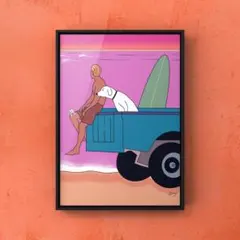 ★A4フレーム付き★オリジナル アートポスター SUNDAY サーフィン 犬 猫