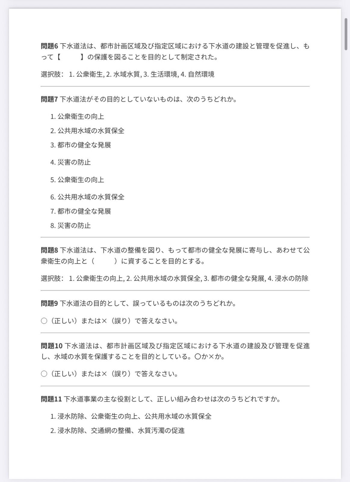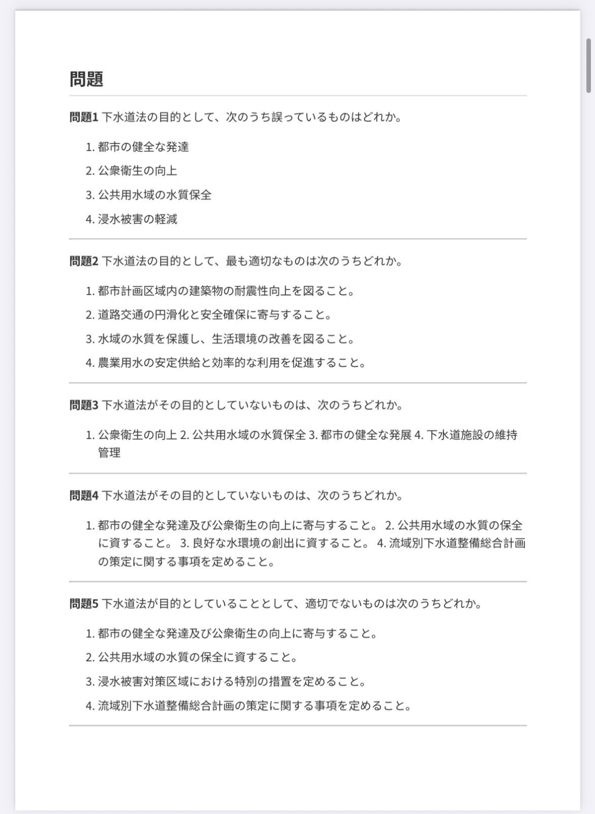 【合格への近道】下水道排水設備工事責任技術者試験 問題集300問 下水道排水設備工事責任技術者試験の合格を目指すあなたへ! この問題集は、本試験の出題形式と出題範囲を徹底的に分析し、合格に必要な知識を効率的に習得できるように作成しました。 この問題集の特徴 * 試験形式に完全対応: 本試験と同じ択一式、穴埋め式、〇×式を組み合わせた形式で、本番さながらの演習が可能です。 * 徹底した出題範囲の網羅: **法令分野(30点)と技術分野(70点)**の出題範囲を完全にカバー。各分野の合格基準を満たすための対策ができます。 * 豊富な問題数: 合格に必要な知識を定着させるため、300問を厳選して収録しました。 * 丁寧な解説付き: 各問題には、正解・不正解の理由を詳しく解説。単に答えを覚えるだけでなく、深い理解を促します。 こんな方におすすめ * 独学で合格を目指している方 * 効率的に学習したい方 * 忙しくて勉強時間の確保が難しい方 * 問題演習をたくさんこなしたい方 この問題集で繰り返し演習を行い、合格に必要な実力を身につけましょう! ご不明な点がありましたら、お気軽にお問い合わせください。