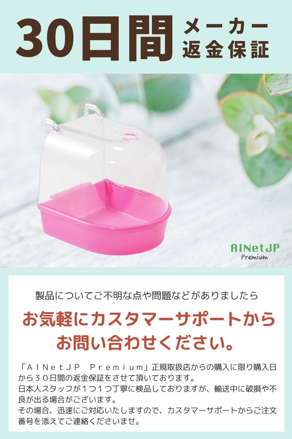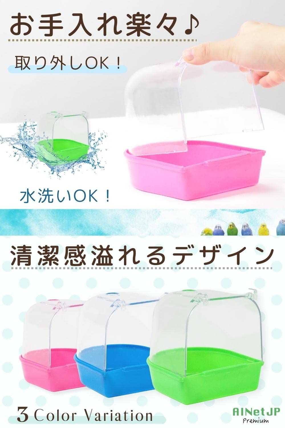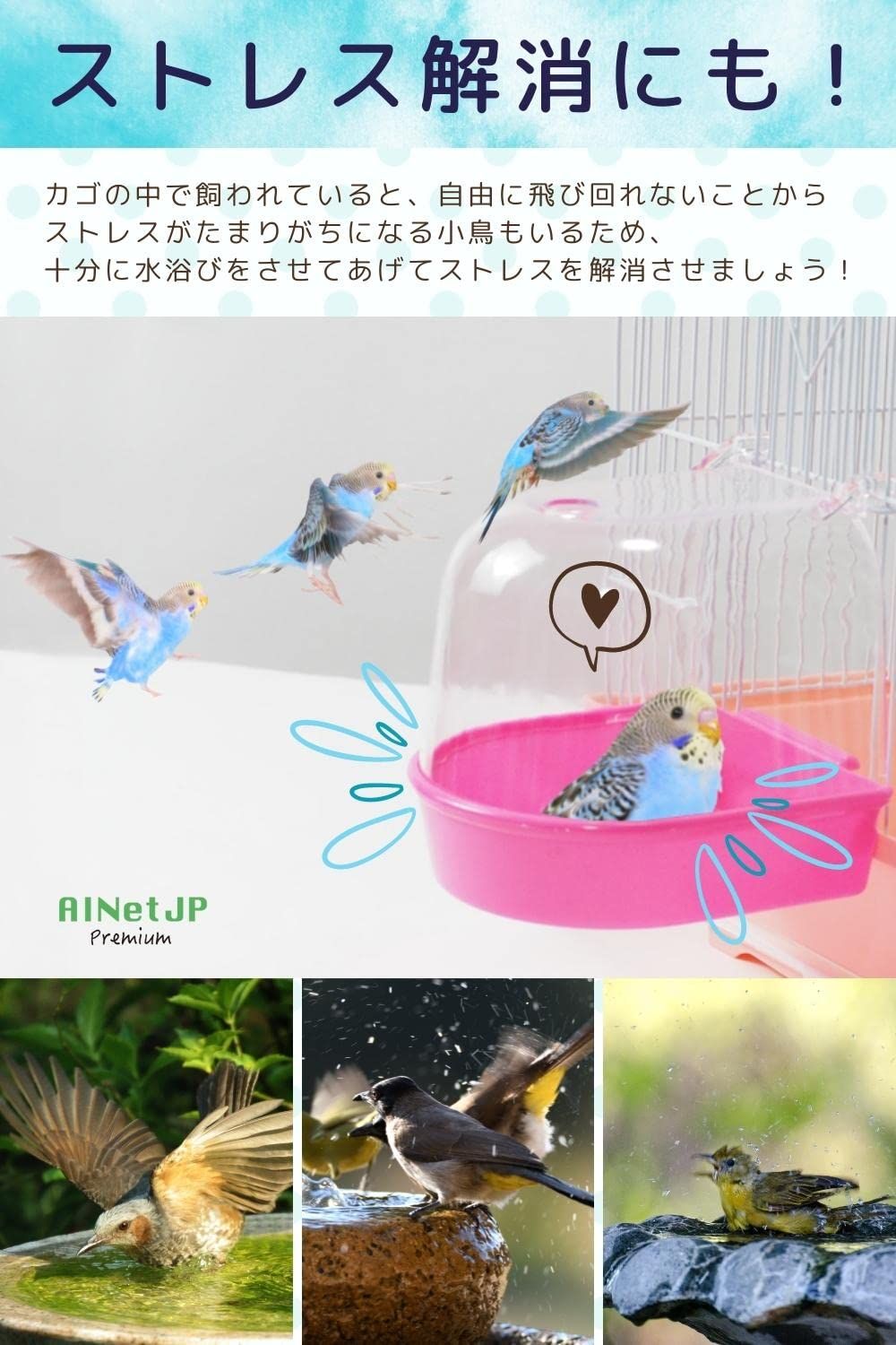 鳥の羽根には、ホコリや寄生虫、脂粉といわれる細かな白い粉などがだんだんと積もっていくため、水浴びをすることによってそれらを落とそうとしているといわれています。「AINetJP Premium」製の水浴び用容器は、ケージに簡単に設置することが可能です。小鳥がすっぽりと入る適度なサイズ感で、フタつきで覆われているので水の跳ね飛びを防ぎます。鳥の種類によっては、水浴びをする頻度に差がありますが、羽をきれいにすることは鳥にとって大切なことです。水浴びの環境がないと病気になる場合もあるため、生活環境をしっかりと整えて水浴びができるようにしてあげましょう!【