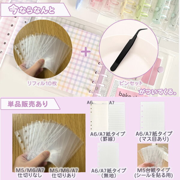 【ピンセット付き】シール帳 バインダー ミニ 全44種 リフィル 単品 透明 M5 A7 クリア カラフル バインダー 穴開きシート シールバインダー シール手帳 台紙 クリアバインダー シール収納 ミニサイズ 推し活グッズ ぷくぷくシール フィルム シール帳 システム手帳