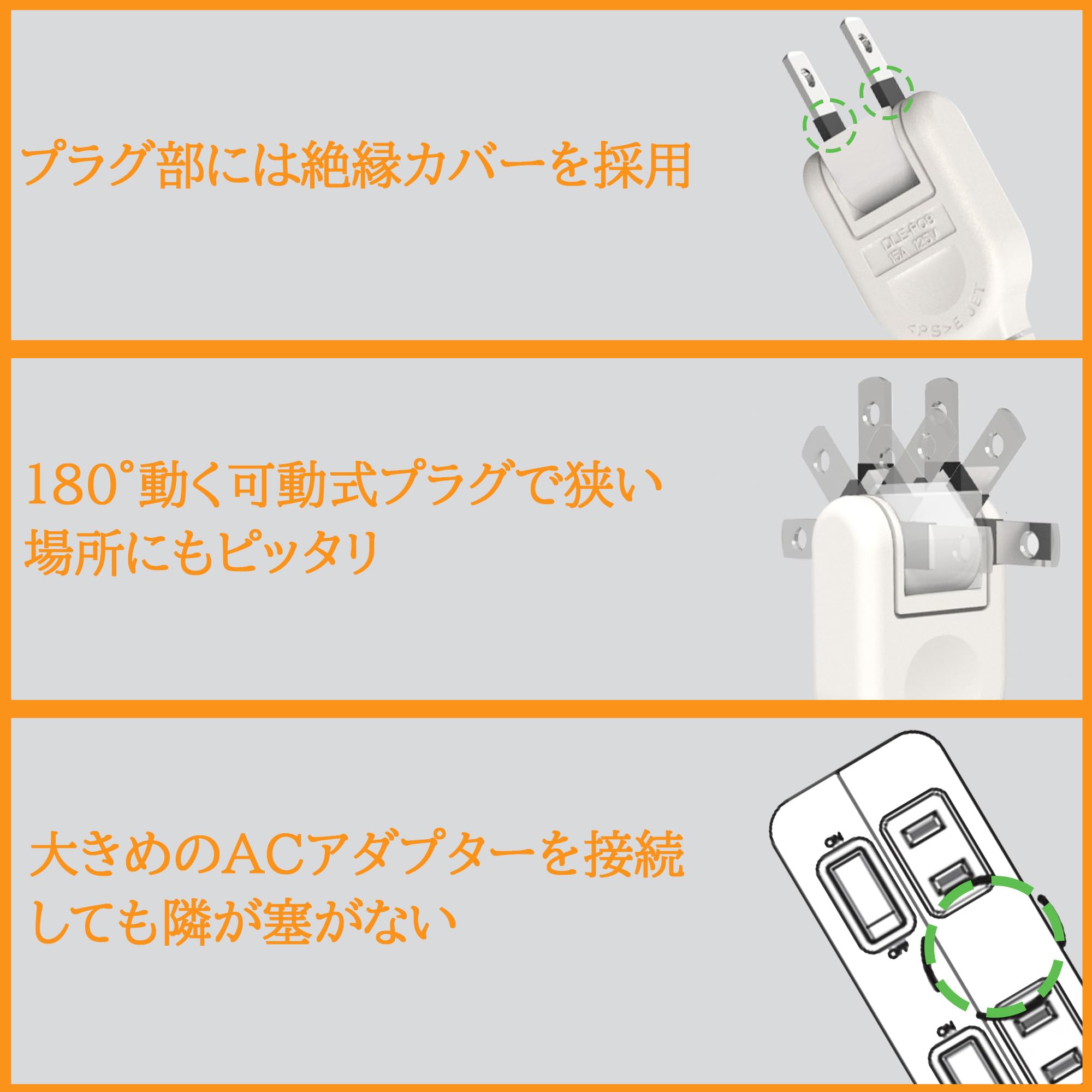 ■180°スイングプラグ:狭い場所でも配線しやすく、家具に隠れがちな壁コンセントを無駄にしません。