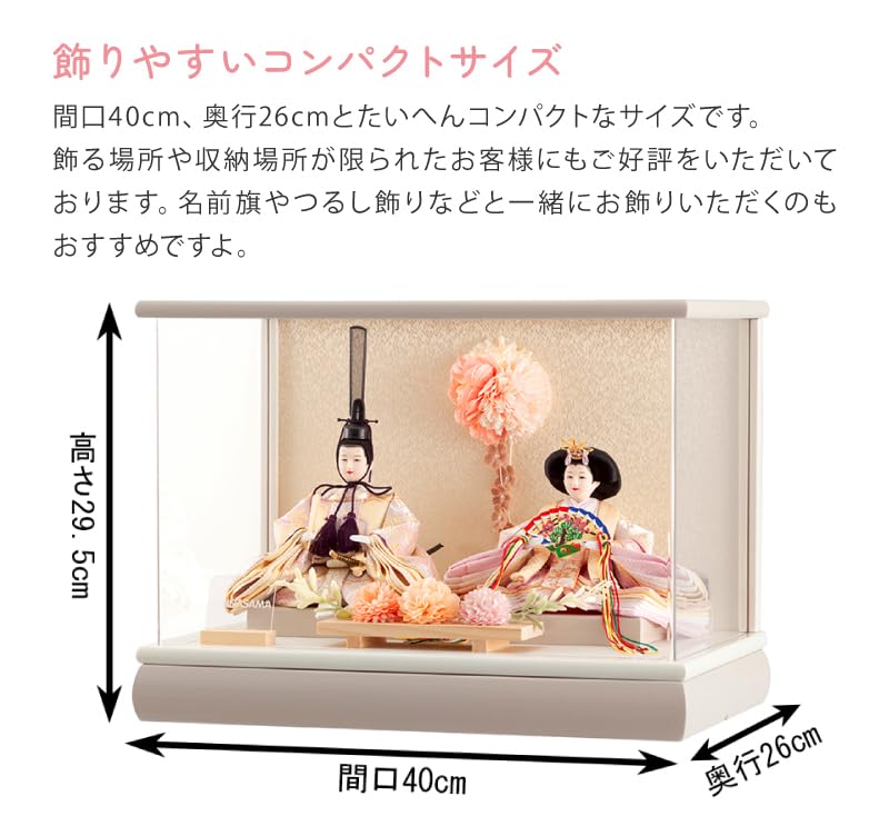 バイカラーのアイボリーのケースや、やわらかな風合いの花飾りなどデザイン性の高い一式で、ぜひお子様の初節句をお祝いください。