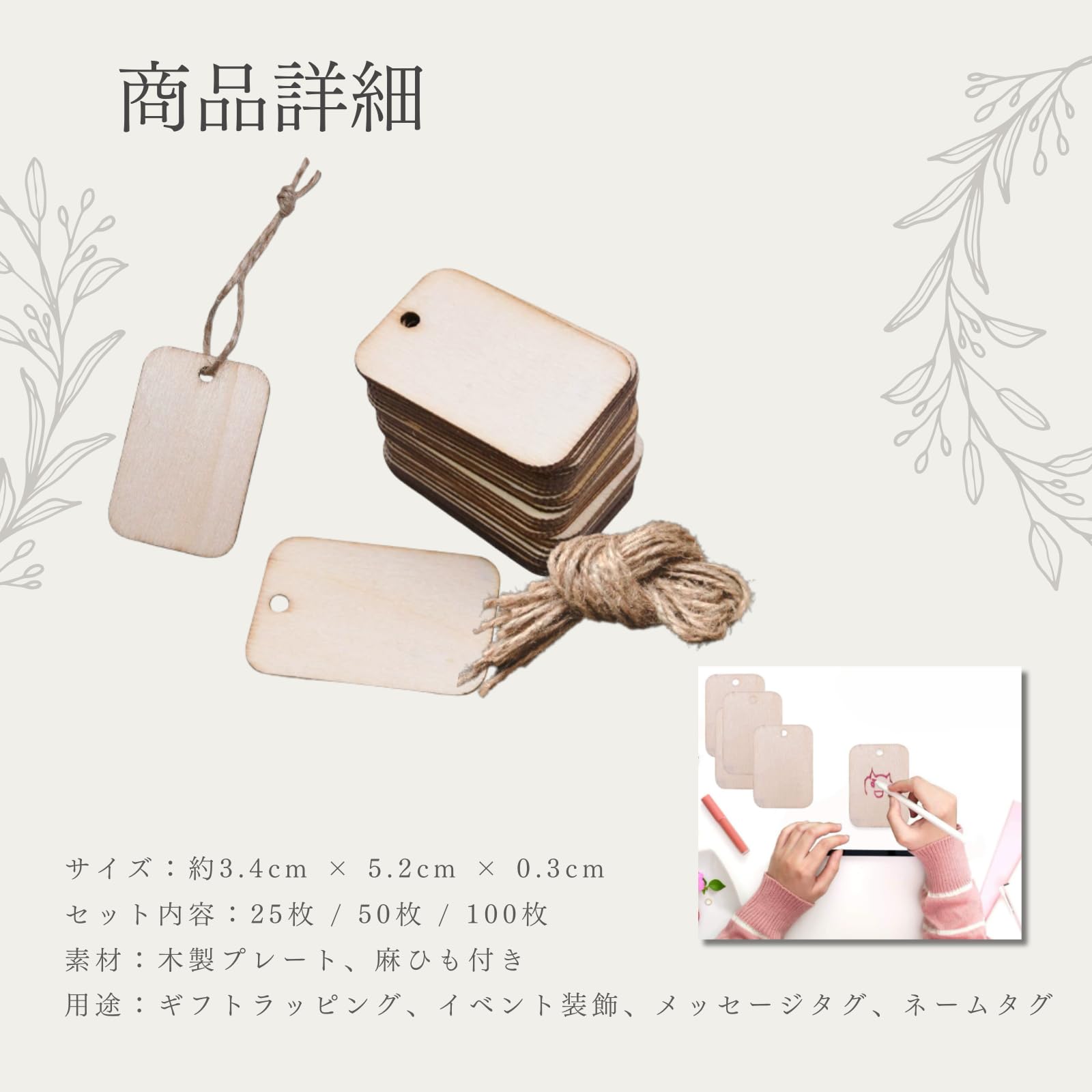 | 主な素材: | 木材(プレート), 麻(紐) |