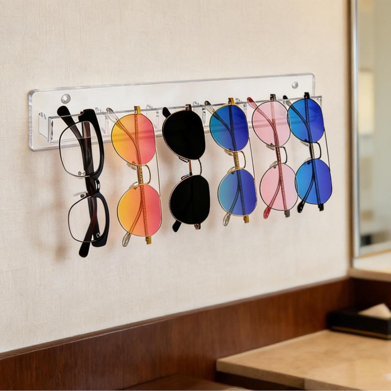 このサングラスディスプレイはアクリル素材で作られ、さまざまな設定で眼鏡を整理するためのエレガントなソリューションを提供します。この多用途のディスプレイラックはサングラスを整然と並べ、簡単にアクセスできるようにします。家庭、リビングルーム、クローゼット、アパートの玄関、職場などの環境に最適です。その洗練されたデザインは小売店にも適しており、眼鏡を視認性高く保護します。