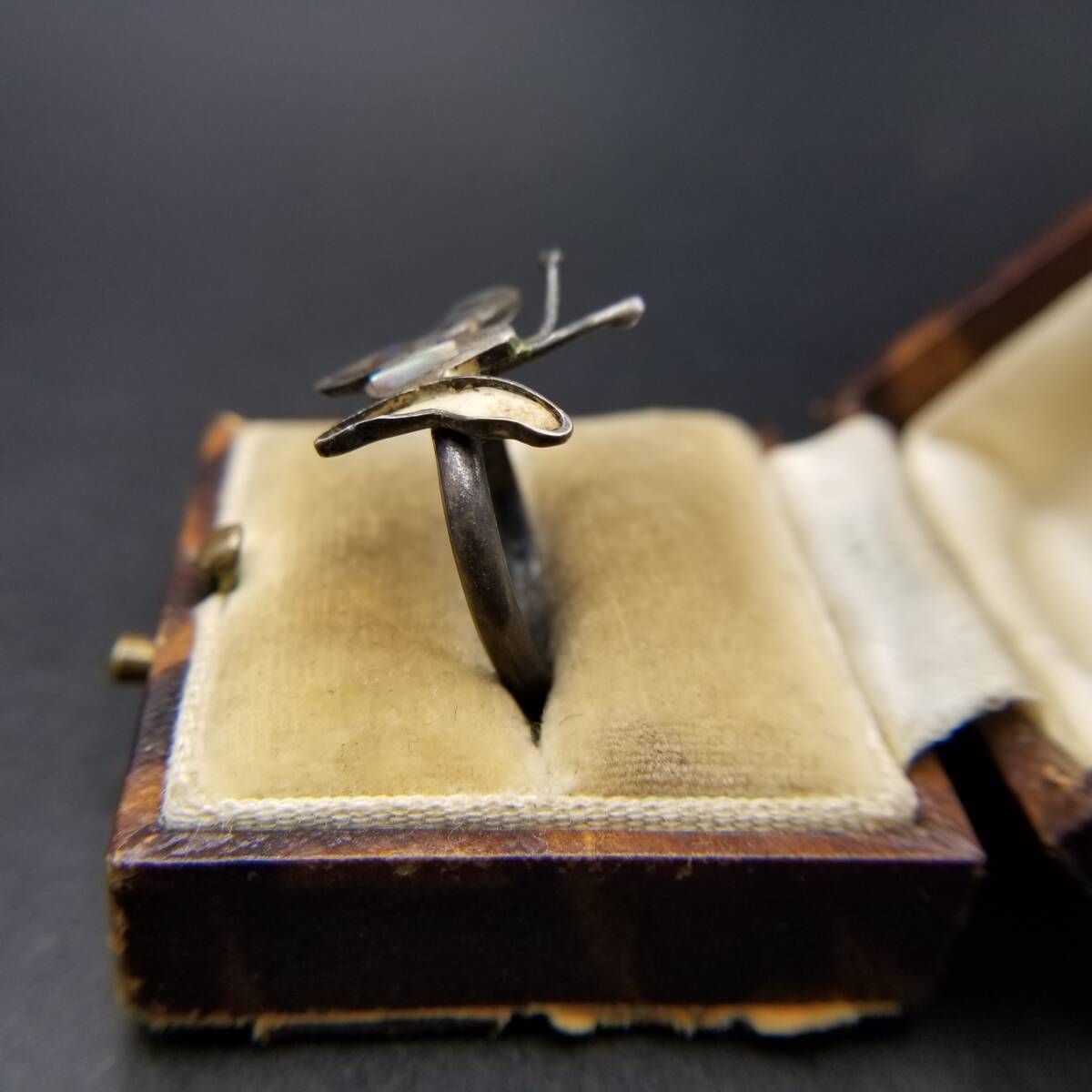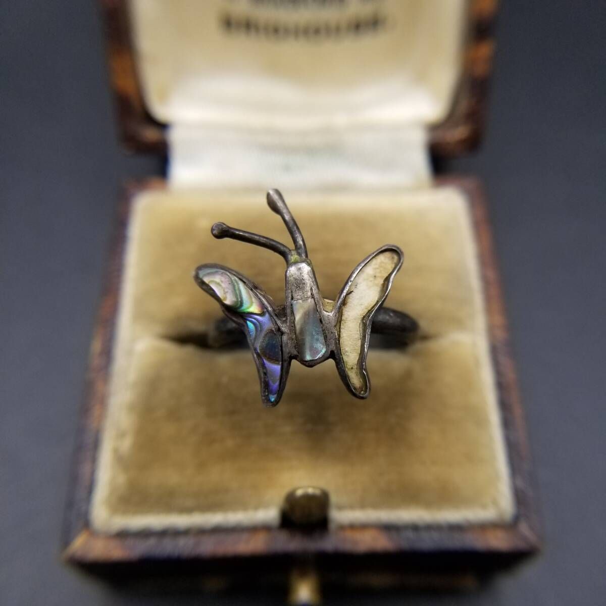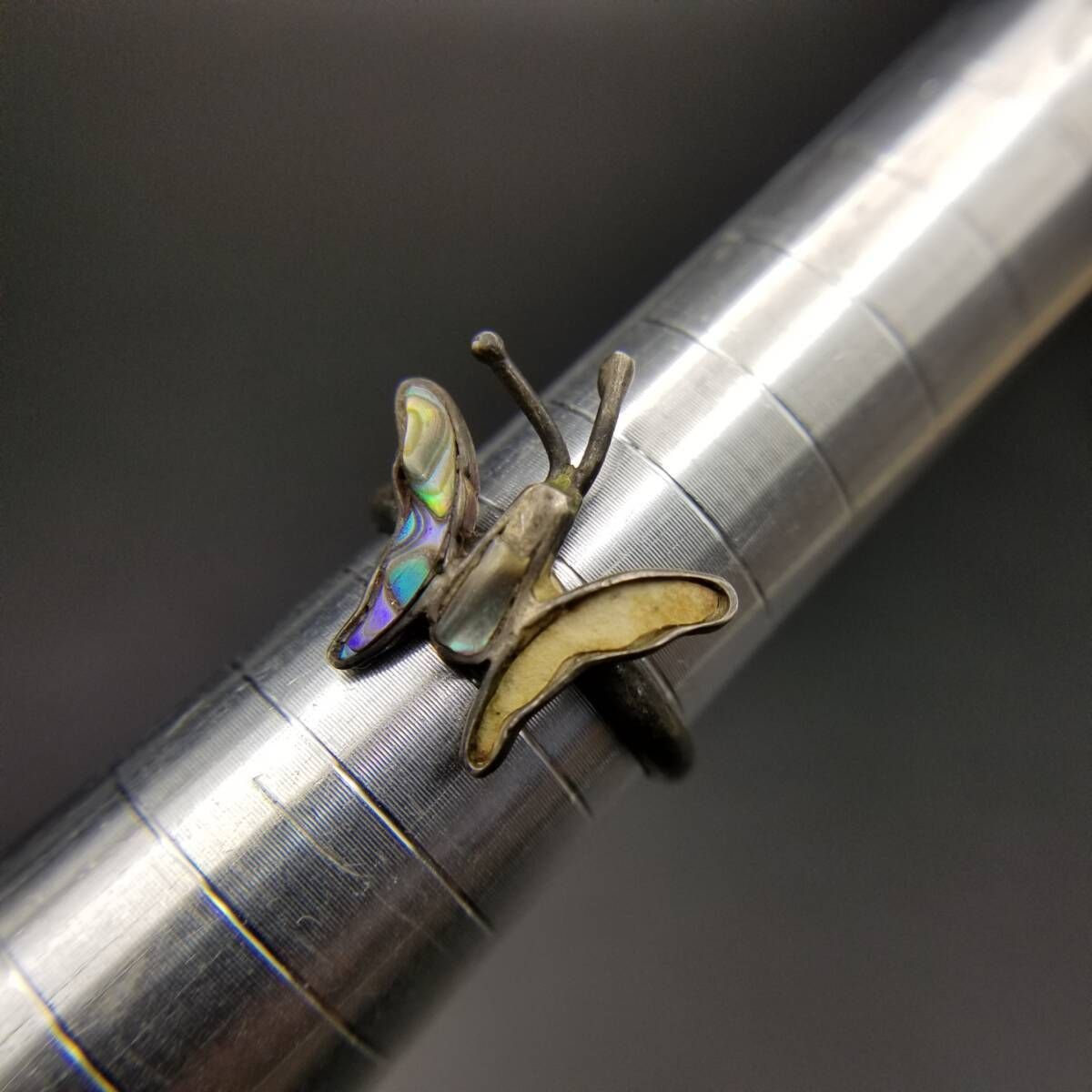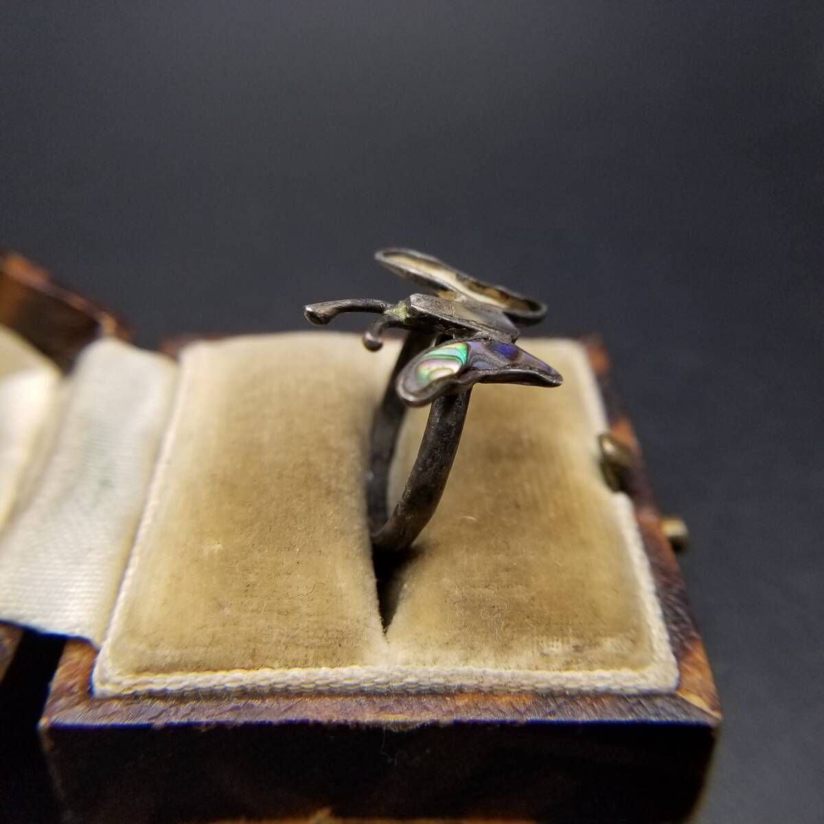 40'50's メキシコ 925 シルバー 蝶 アバロンシェル インレイ ヴィンテージ リング 銀 指輪 Taxco タスコ 華奢 昆虫モチーフ Y23-G