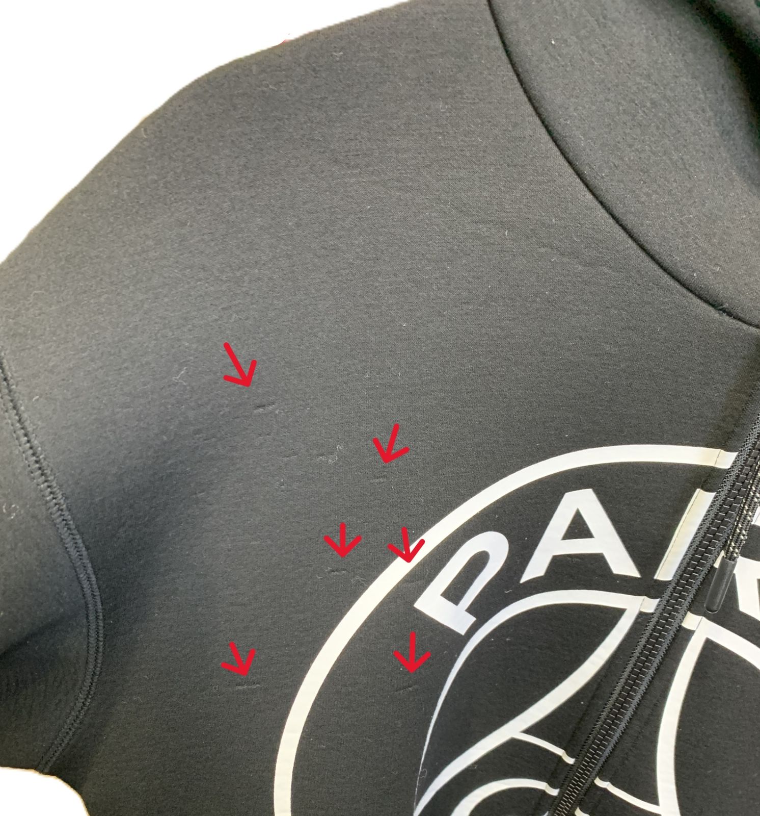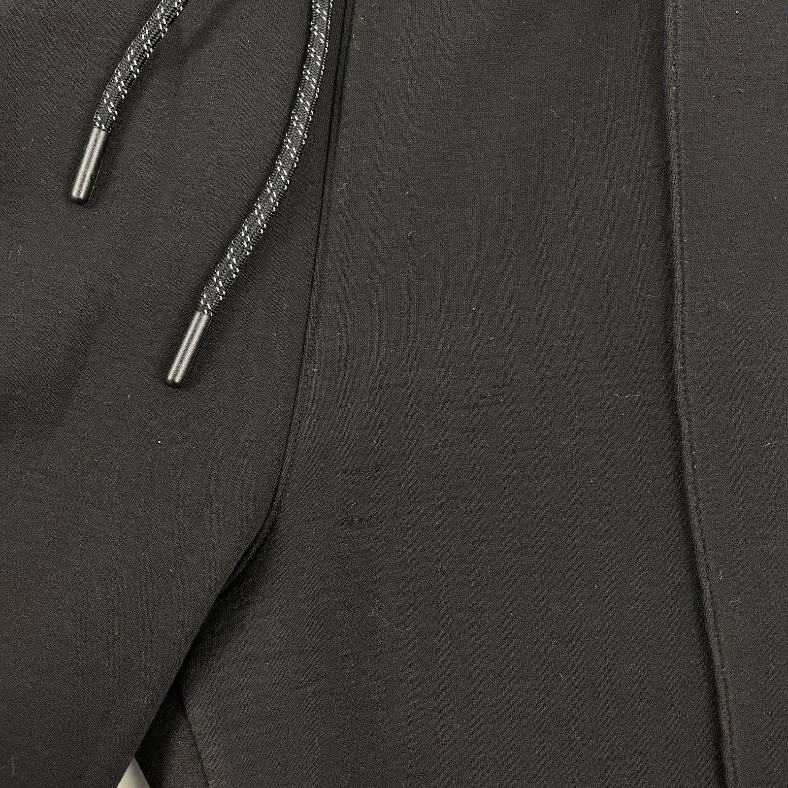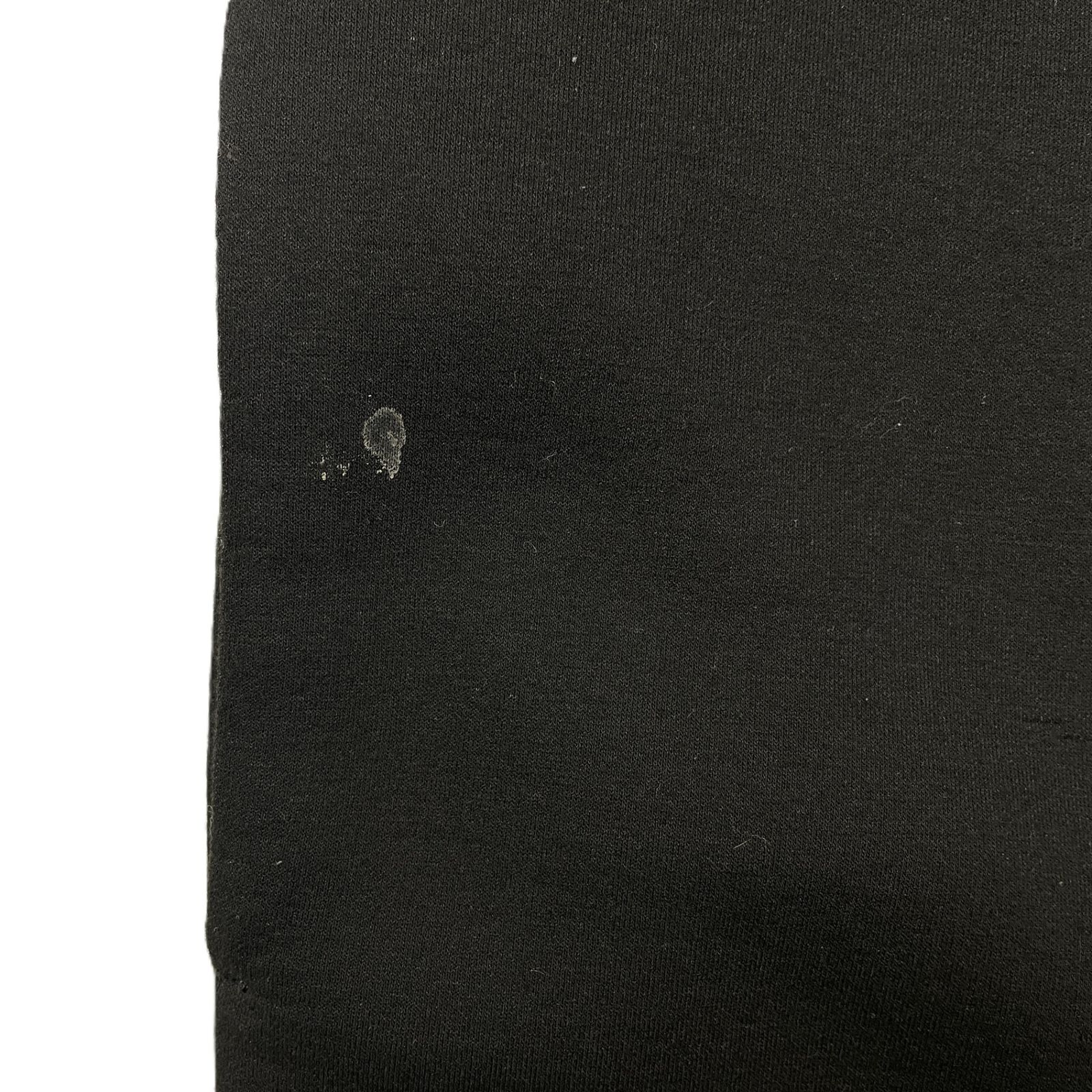 ダンボールニットのような素材感で6枚目のような潰れ・クセが全体にあります。トップスの右前ポケット口に汚れ(7枚目)、パンツ後ろポケットのロゴに剥がれ(8枚目)、袖の脇、股下、フードなどに毛羽立ち(9枚目)があります。