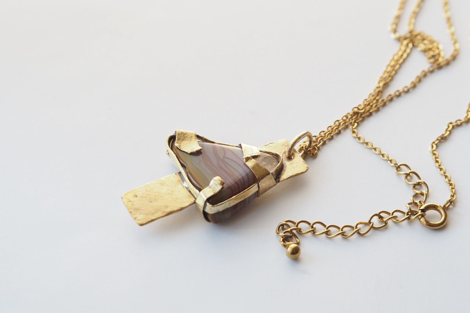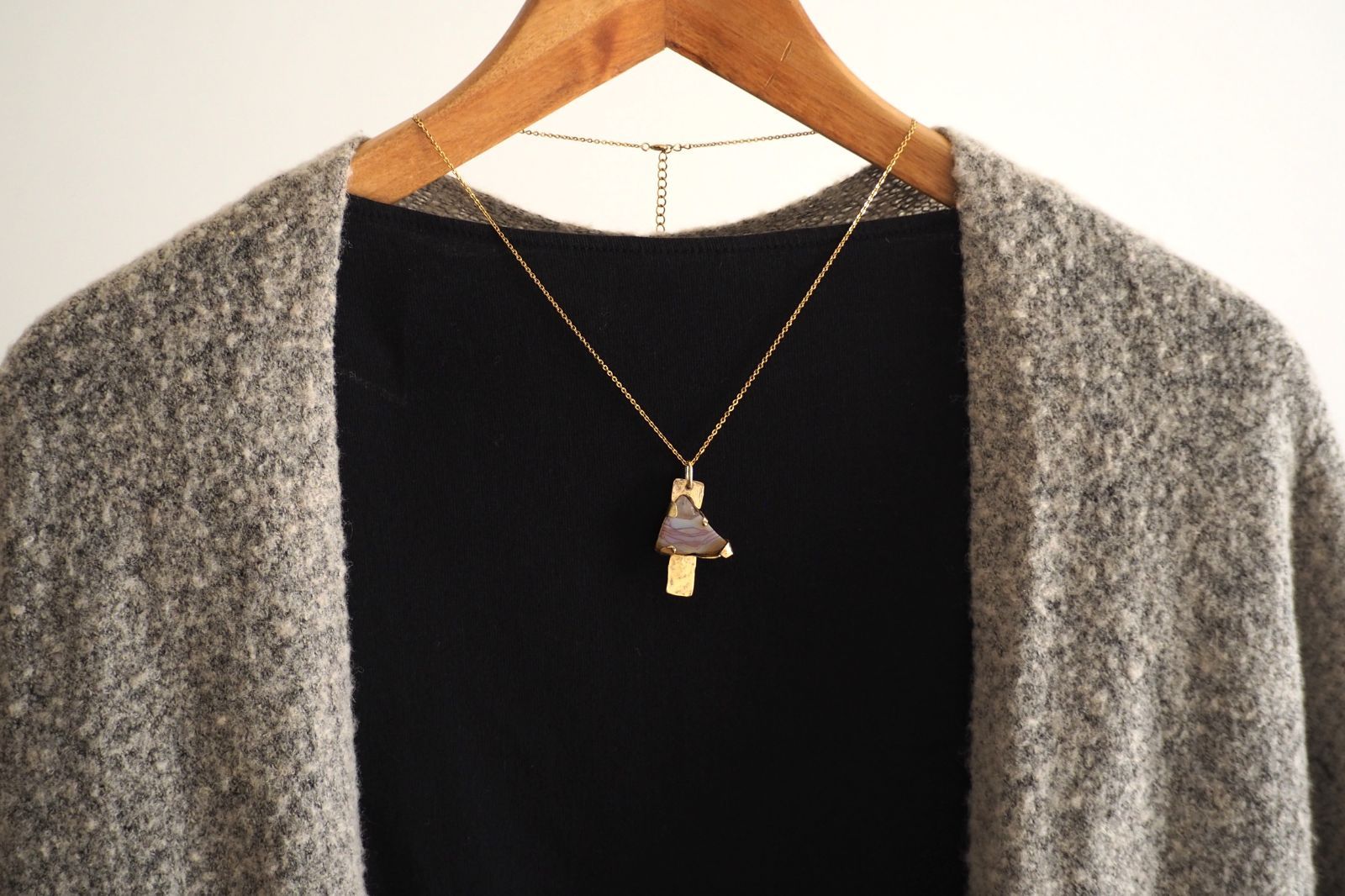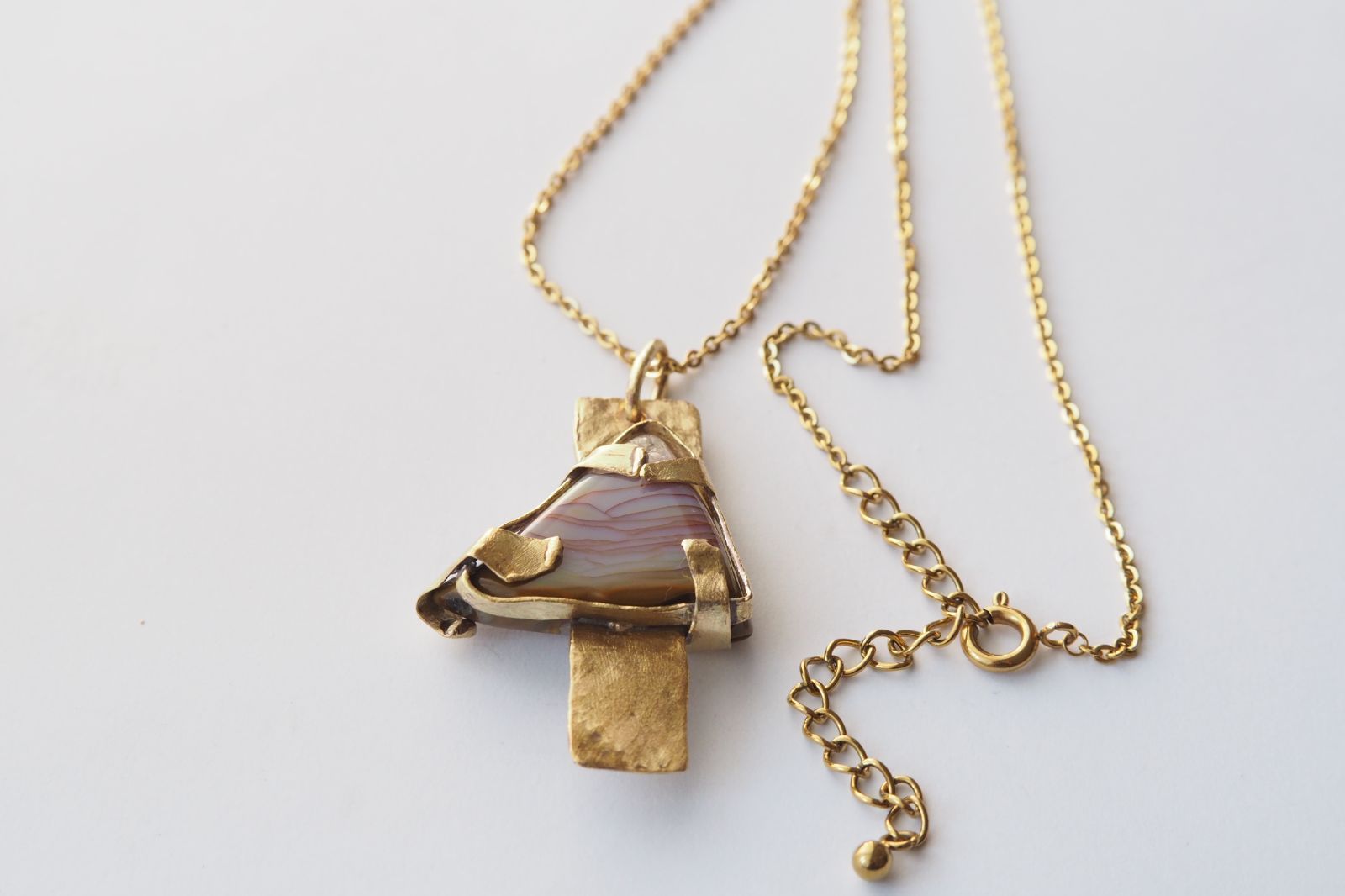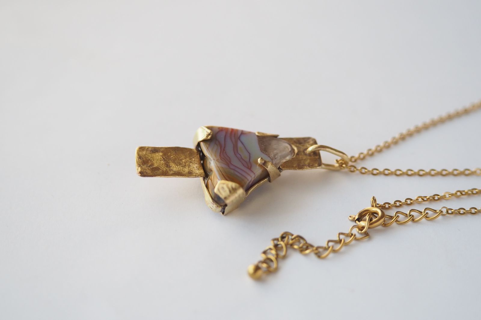 ソムニウム ラテン語で[夢]  モンタナアゲートと真鍮のネックレス チェーンは金属アレルギー対応のサージカルステンレスチェーンとなります グレーと赤褐色、先端の水晶層がたのしめるアゲート もやもやとつかみどころのない模様が、寝ているときに見る「夢」のよう 爪(ワイヤー)ではなく先端を溶かした薄い真鍮板で覆うように石を留めています 古いもののような、ヴィンテージ感のある仕上がりです シンプルなシャツやワンピースのアクセントに 真鍮プレートを切り出し槌目をつけ、平たく打った真鍮ワイヤー・バーナーで溶かした薄い真鍮プレートとともに成形し段階的に銀ロウ付け(溶接)、磨いてアゲートをとりつけました チェーン通し用のカンもつなぎ目を溶接しています ■ペンダントトップ 素材:真鍮、アゲート(瑪瑙) 溶接部分は銀ロウですので銀色になります 大きさ:縦43×横25×厚み8mm カンを含めない大きさ:縦37×横25×厚み8mm 重さ:5.5g 天然石の大きさ:24×19×5mm ■チェーン:サージカルステンレス (画像のものです) イオンプレーティング加工を施した、生地がサージカルステンレスSUS316Lのチェーンです ニッケルフリーで耐久性、耐摩耗性に優れた金属アレルギー対応チェーン(すべての人にアレルギーが出ないことを保証するものではありません)  ・幅 約1.5mm 小豆チェーン  ・長さ 45cm+アジャスター5.5cm  ・重さ 2.1g  ・メーカー 貴和製作所 (商品番号63439403) *お手持ちのチェーンに取り付ける等でネックレスチェーンがご不要の方はご購入前にメッセージしてください。 チェーン代880円をお値引きした価格(2600円)でペンダントトップのみお届けします *お取り扱いには十分ご注意ください。特に落下などの衝撃にはお気をつけくださいますようお願い申し上げます。石の先端は水晶となり、細かいクラックが入っているため特にお気を付けください。 *石が大きくぐらついてきたり、爪がずれたり曲がったりした場合にはそのまま使用せず修理のご相談をお願いいたします。 *元々ヴィンテージのようにした作品となりますが、さらにアンティークのようになってくる真鍮のエイジングもお楽しみください。お手入れはシルバー用ジュエリークリーナー液をおすすめします。一般的なジュエリークリーナー液は瑪瑙にも使用できますが、説明書をご確認の上必ず数秒で洗い流してください。 ■緩衝材を使いラッピング+封筒+ネコポス(らくらくメルカリ便・匿名配送)でお届けします