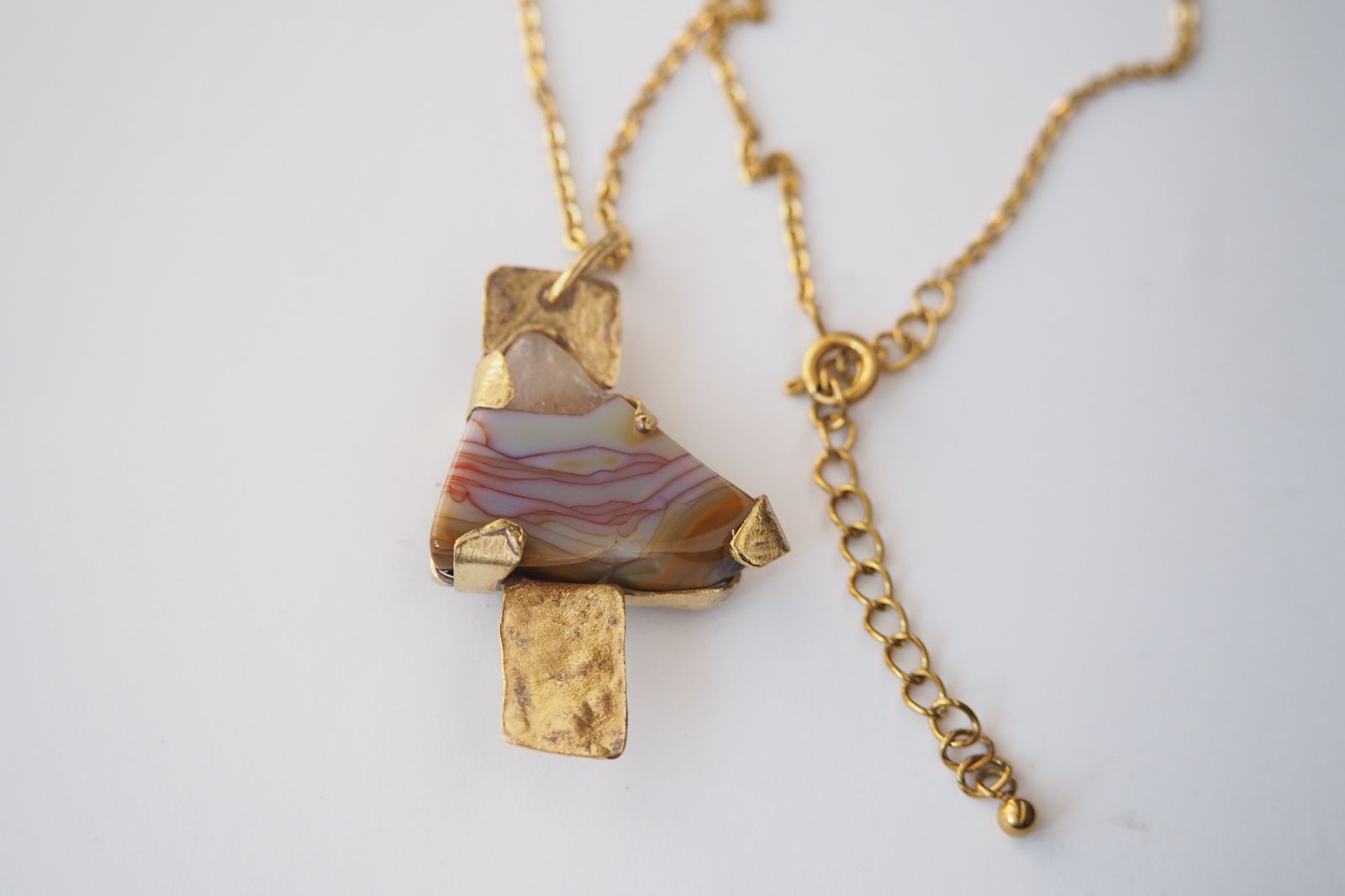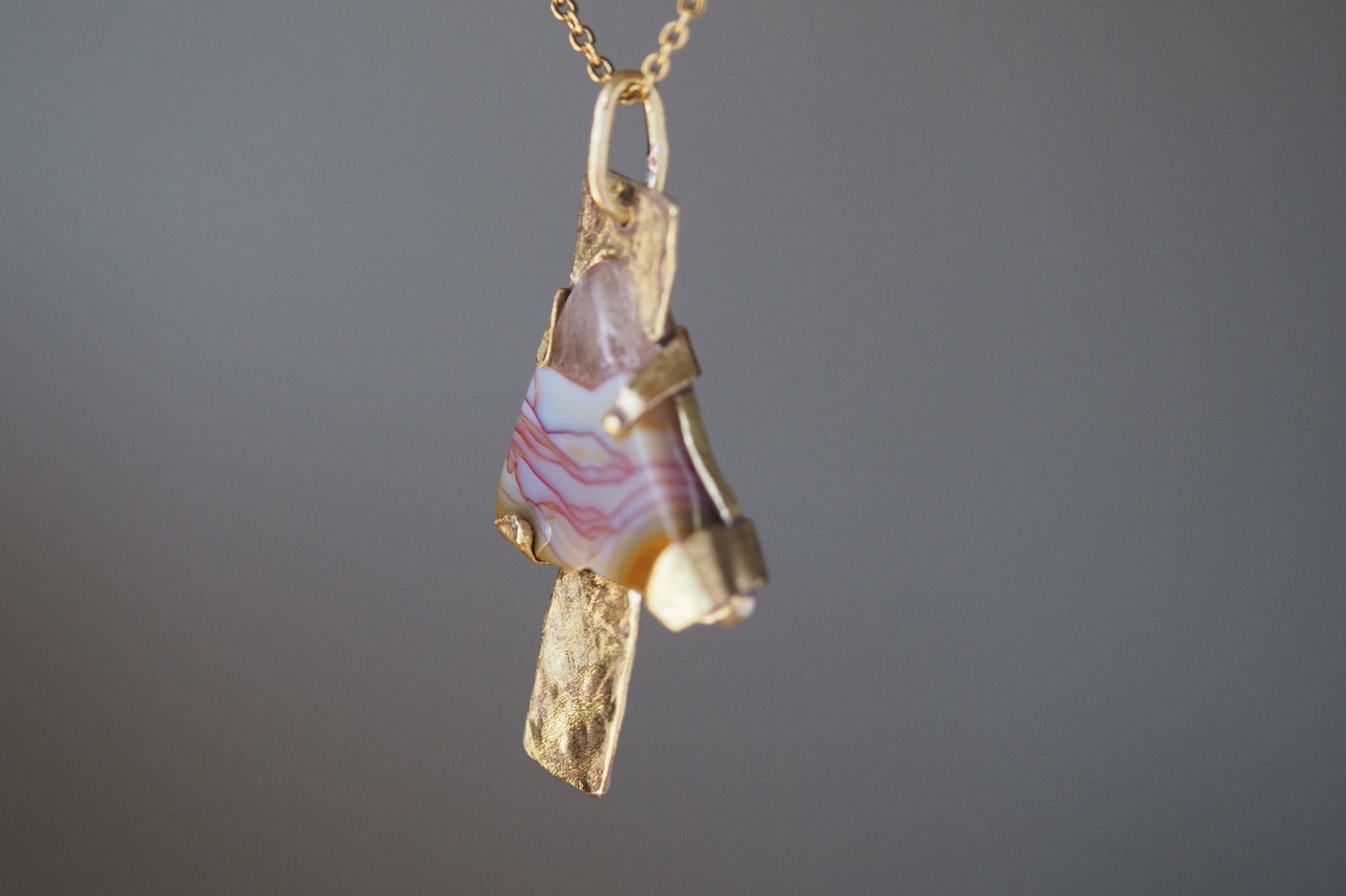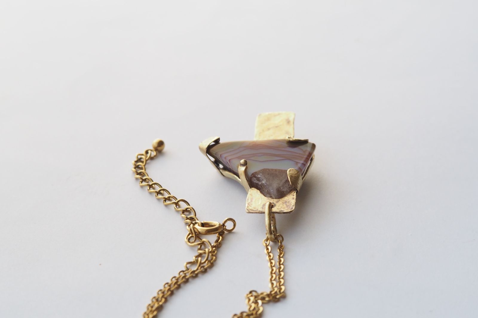 ソムニウム ラテン語で[夢]  モンタナアゲートと真鍮のネックレス チェーンは金属アレルギー対応のサージカルステンレスチェーンとなります グレーと赤褐色、先端の水晶層がたのしめるアゲート もやもやとつかみどころのない模様が、寝ているときに見る「夢」のよう 爪(ワイヤー)ではなく先端を溶かした薄い真鍮板で覆うように石を留めています 古いもののような、ヴィンテージ感のある仕上がりです シンプルなシャツやワンピースのアクセントに 真鍮プレートを切り出し槌目をつけ、平たく打った真鍮ワイヤー・バーナーで溶かした薄い真鍮プレートとともに成形し段階的に銀ロウ付け(溶接)、磨いてアゲートをとりつけました チェーン通し用のカンもつなぎ目を溶接しています ■ペンダントトップ 素材:真鍮、アゲート(瑪瑙) 溶接部分は銀ロウですので銀色になります 大きさ:縦43×横25×厚み8mm カンを含めない大きさ:縦37×横25×厚み8mm 重さ:5.5g 天然石の大きさ:24×19×5mm ■チェーン:サージカルステンレス (画像のものです) イオンプレーティング加工を施した、生地がサージカルステンレスSUS316Lのチェーンです ニッケルフリーで耐久性、耐摩耗性に優れた金属アレルギー対応チェーン(すべての人にアレルギーが出ないことを保証するものではありません)  ・幅 約1.5mm 小豆チェーン  ・長さ 45cm+アジャスター5.5cm  ・重さ 2.1g  ・メーカー 貴和製作所 (商品番号63439403) *お手持ちのチェーンに取り付ける等でネックレスチェーンがご不要の方はご購入前にメッセージしてください。 チェーン代880円をお値引きした価格(2600円)でペンダントトップのみお届けします *お取り扱いには十分ご注意ください。特に落下などの衝撃にはお気をつけくださいますようお願い申し上げます。石の先端は水晶となり、細かいクラックが入っているため特にお気を付けください。 *石が大きくぐらついてきたり、爪がずれたり曲がったりした場合にはそのまま使用せず修理のご相談をお願いいたします。 *元々ヴィンテージのようにした作品となりますが、さらにアンティークのようになってくる真鍮のエイジングもお楽しみください。お手入れはシルバー用ジュエリークリーナー液をおすすめします。一般的なジュエリークリーナー液は瑪瑙にも使用できますが、説明書をご確認の上必ず数秒で洗い流してください。 ■緩衝材を使いラッピング+封筒+ネコポス(らくらくメルカリ便・匿名配送)でお届けします