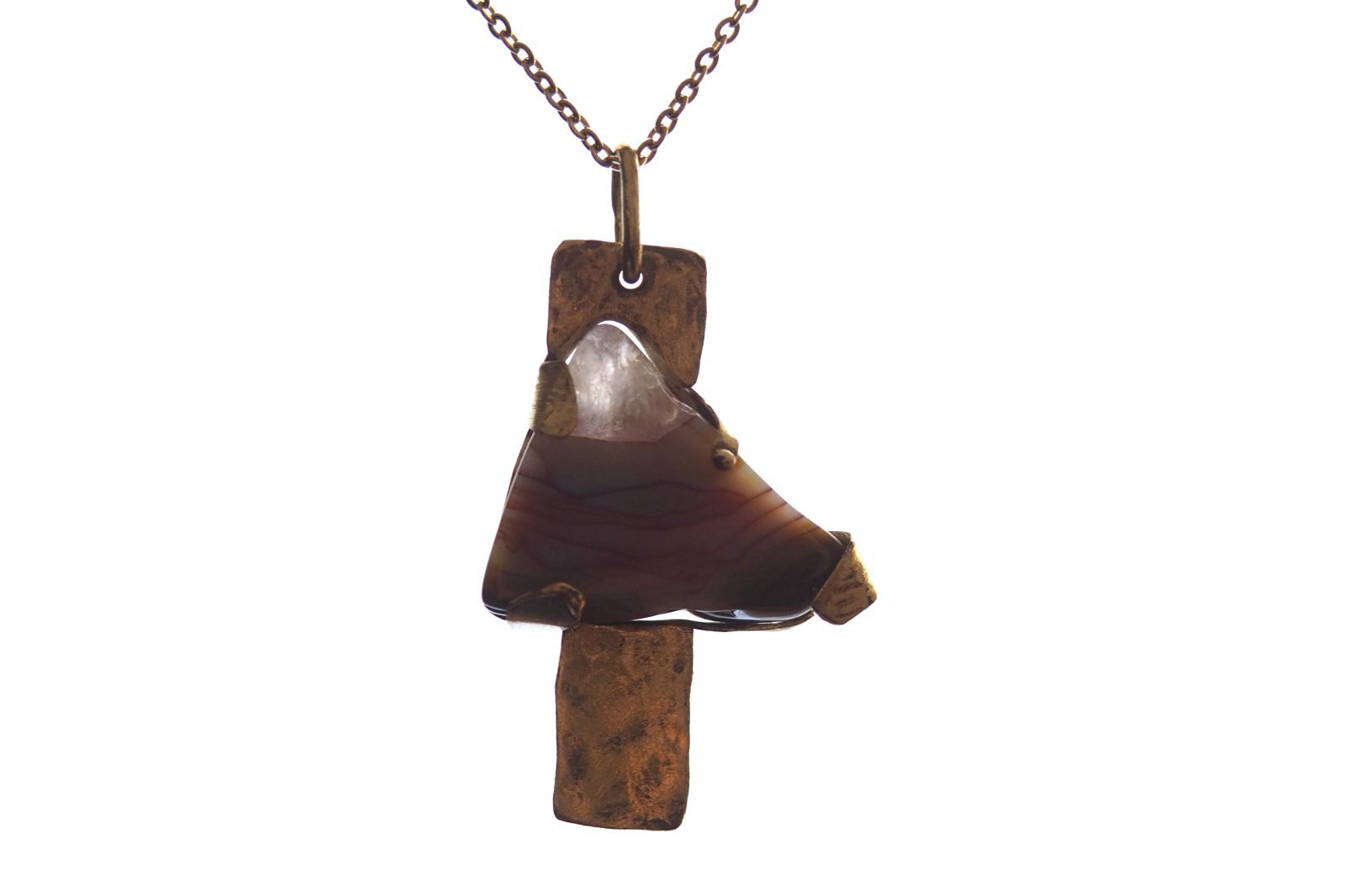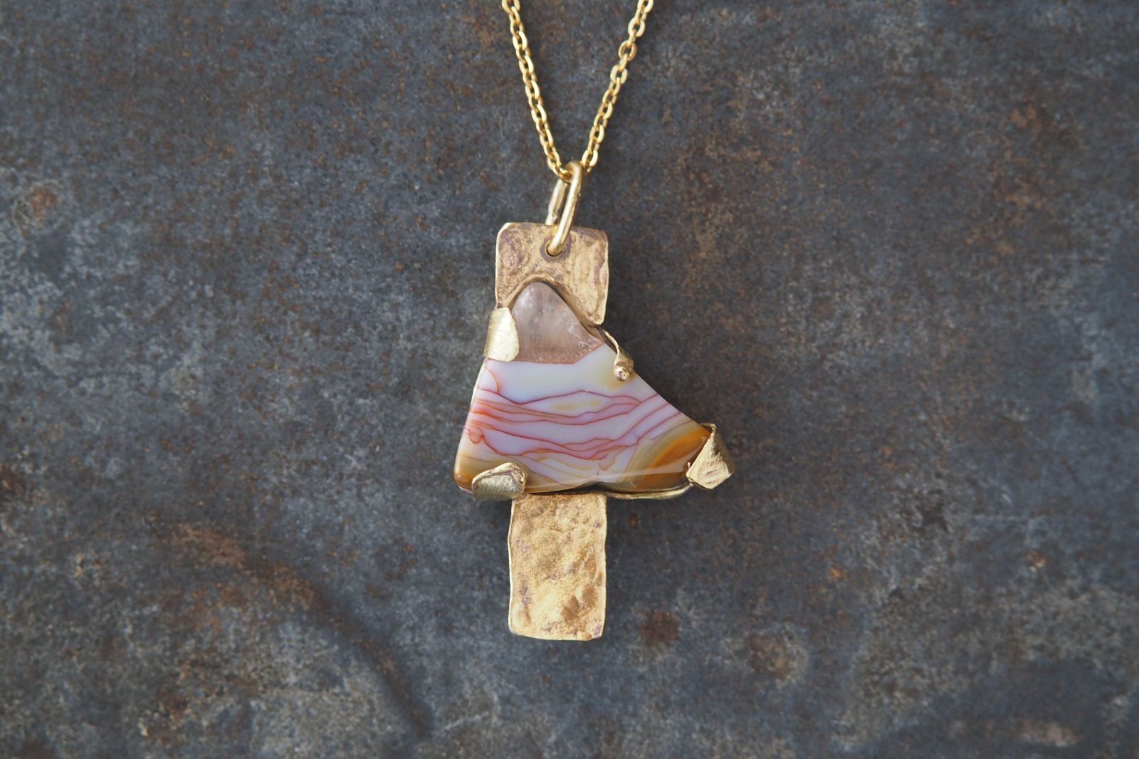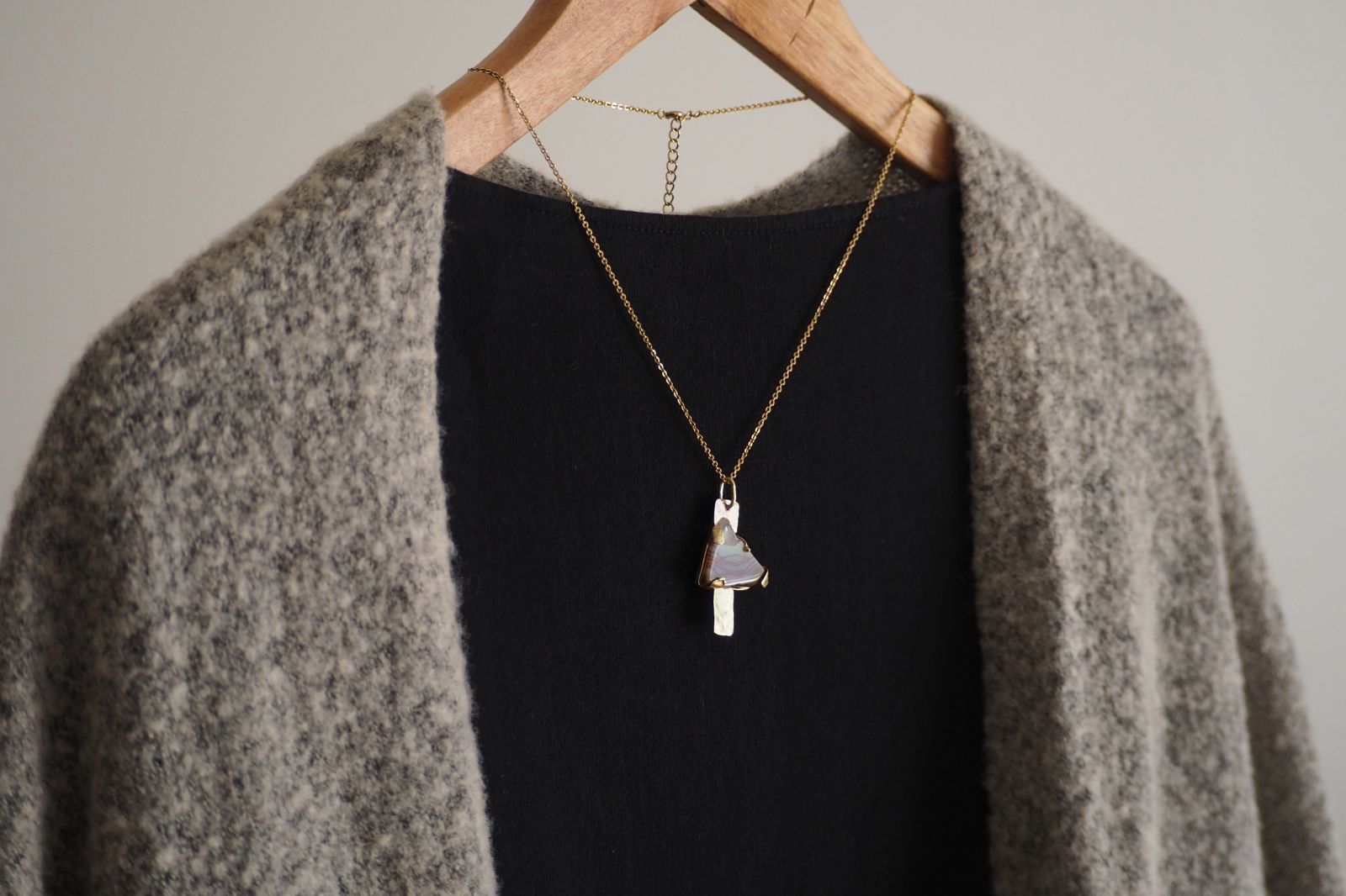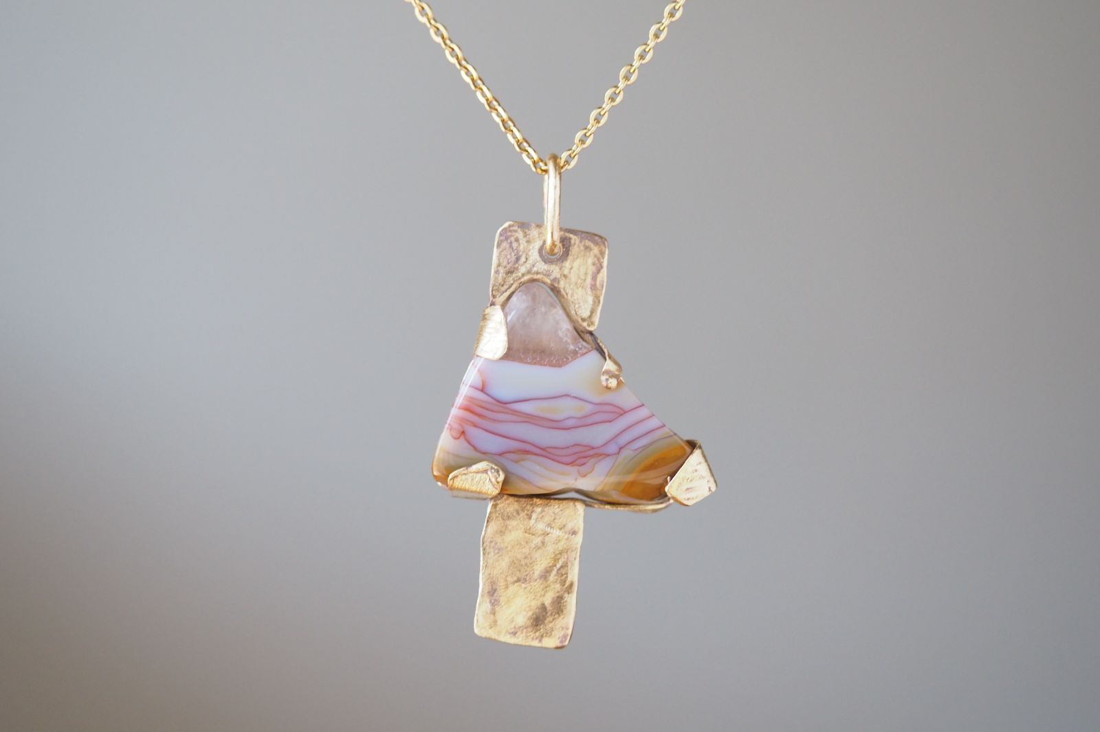 ソムニウム ラテン語で[夢]  モンタナアゲートと真鍮のネックレス チェーンは金属アレルギー対応のサージカルステンレスチェーンとなります グレーと赤褐色、先端の水晶層がたのしめるアゲート もやもやとつかみどころのない模様が、寝ているときに見る「夢」のよう 爪(ワイヤー)ではなく先端を溶かした薄い真鍮板で覆うように石を留めています 古いもののような、ヴィンテージ感のある仕上がりです シンプルなシャツやワンピースのアクセントに 真鍮プレートを切り出し槌目をつけ、平たく打った真鍮ワイヤー・バーナーで溶かした薄い真鍮プレートとともに成形し段階的に銀ロウ付け(溶接)、磨いてアゲートをとりつけました チェーン通し用のカンもつなぎ目を溶接しています ■ペンダントトップ 素材:真鍮、アゲート(瑪瑙) 溶接部分は銀ロウですので銀色になります 大きさ:縦43×横25×厚み8mm カンを含めない大きさ:縦37×横25×厚み8mm 重さ:5.5g 天然石の大きさ:24×19×5mm ■チェーン:サージカルステンレス (画像のものです) イオンプレーティング加工を施した、生地がサージカルステンレスSUS316Lのチェーンです ニッケルフリーで耐久性、耐摩耗性に優れた金属アレルギー対応チェーン(すべての人にアレルギーが出ないことを保証するものではありません)  ・幅 約1.5mm 小豆チェーン  ・長さ 45cm+アジャスター5.5cm  ・重さ 2.1g  ・メーカー 貴和製作所 (商品番号63439403) *お手持ちのチェーンに取り付ける等でネックレスチェーンがご不要の方はご購入前にメッセージしてください。 チェーン代880円をお値引きした価格(2600円)でペンダントトップのみお届けします *お取り扱いには十分ご注意ください。特に落下などの衝撃にはお気をつけくださいますようお願い申し上げます。石の先端は水晶となり、細かいクラックが入っているため特にお気を付けください。 *石が大きくぐらついてきたり、爪がずれたり曲がったりした場合にはそのまま使用せず修理のご相談をお願いいたします。 *元々ヴィンテージのようにした作品となりますが、さらにアンティークのようになってくる真鍮のエイジングもお楽しみください。お手入れはシルバー用ジュエリークリーナー液をおすすめします。一般的なジュエリークリーナー液は瑪瑙にも使用できますが、説明書をご確認の上必ず数秒で洗い流してください。 ■緩衝材を使いラッピング+封筒+ネコポス(らくらくメルカリ便・匿名配送)でお届けします