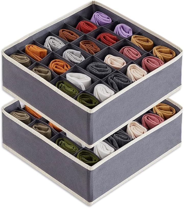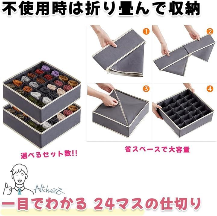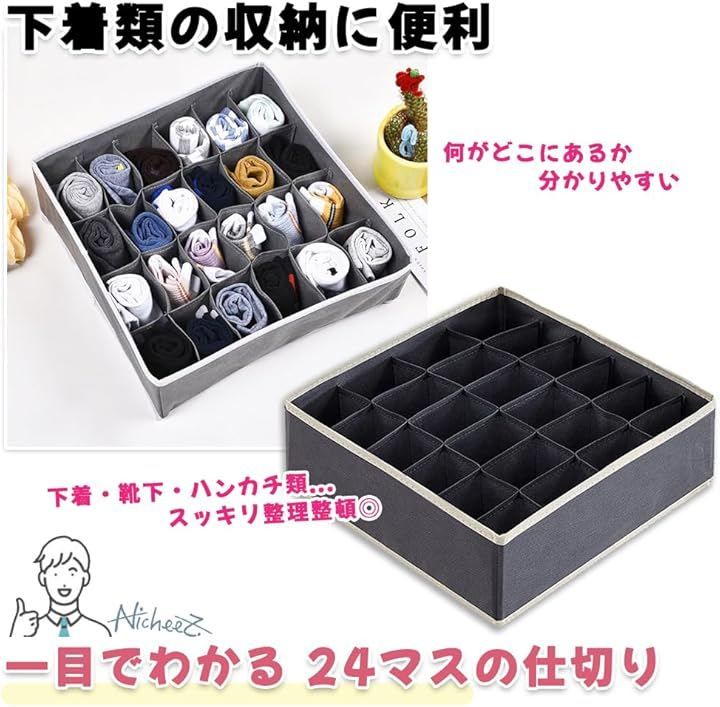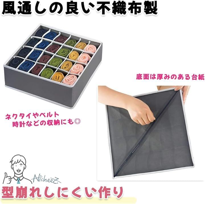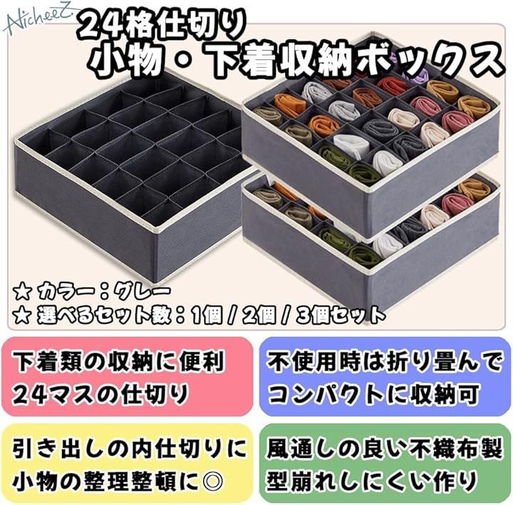 「商品内容」 小物・下着収納ボックス(24マス) セット数:1個/2個セット/3個セット 材質:不織布 カラー:グレー サイズ:縦/約30cm 横/約30cm 高さ/約10.8cm 1マスのサイズ/約7.5cmx約5cm