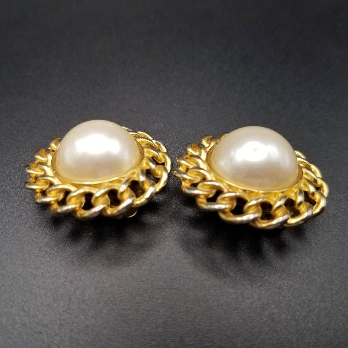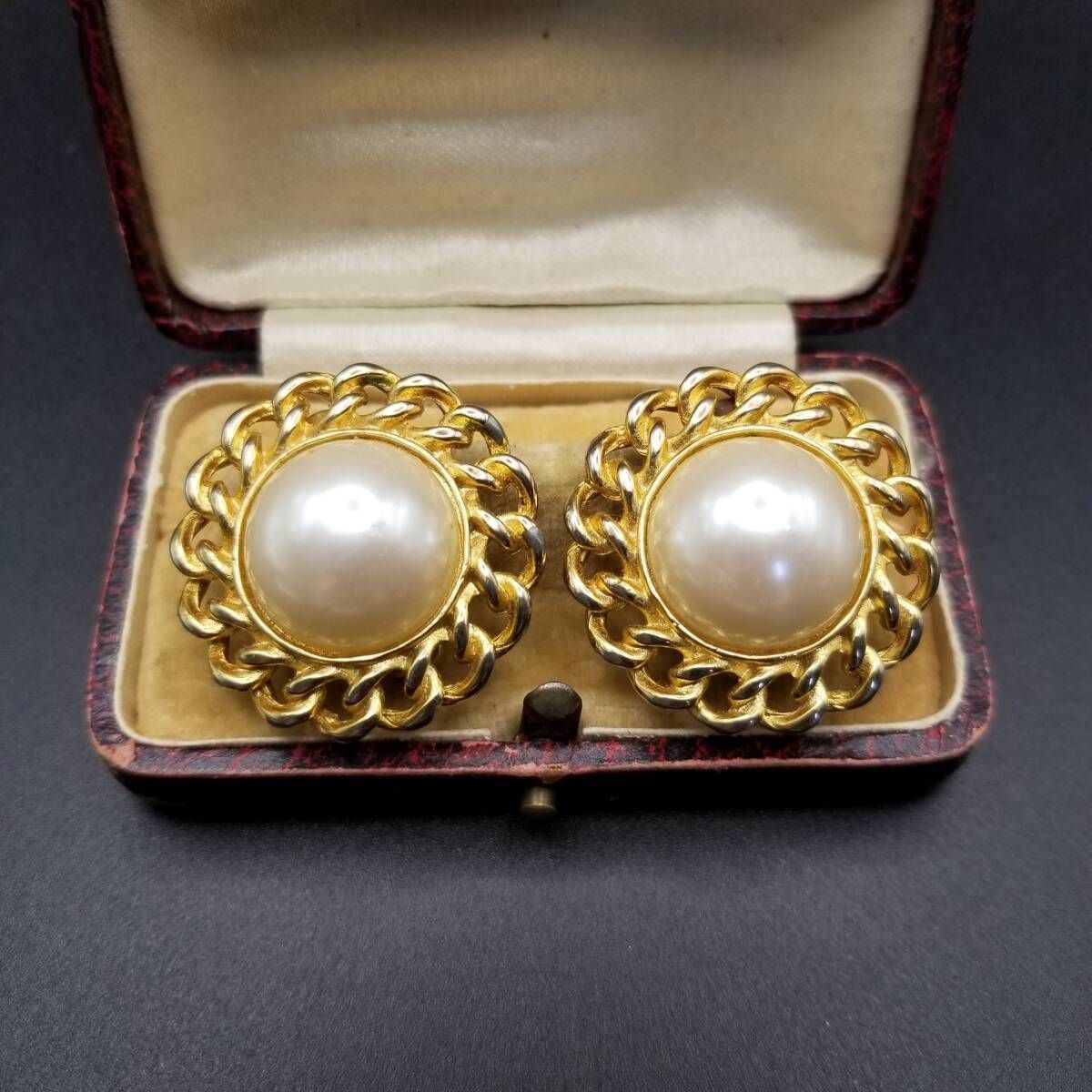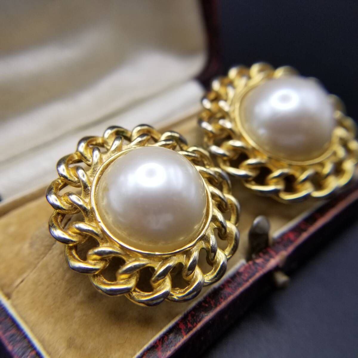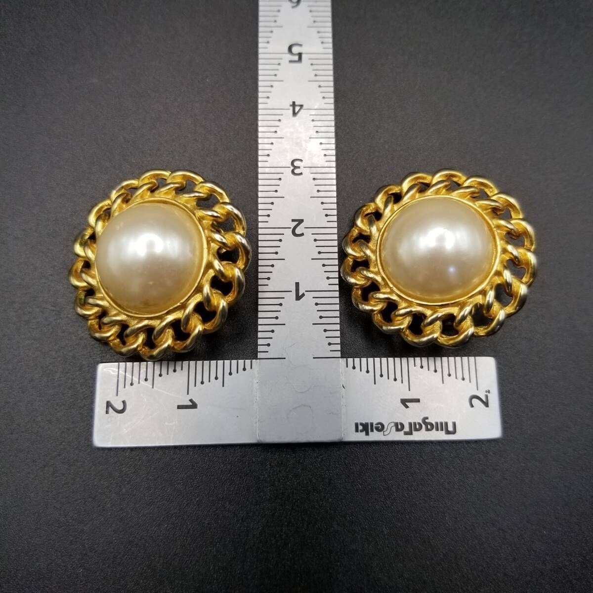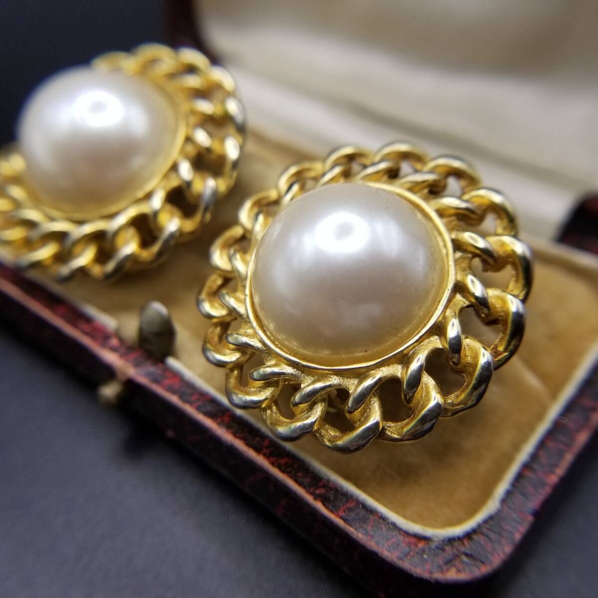 ゴールドチェーン フレーム パール 大ぶり ヴィンテージ クリップ イヤリング ラウンド レトロ ファッションジュエリー 存在感 Y18-W