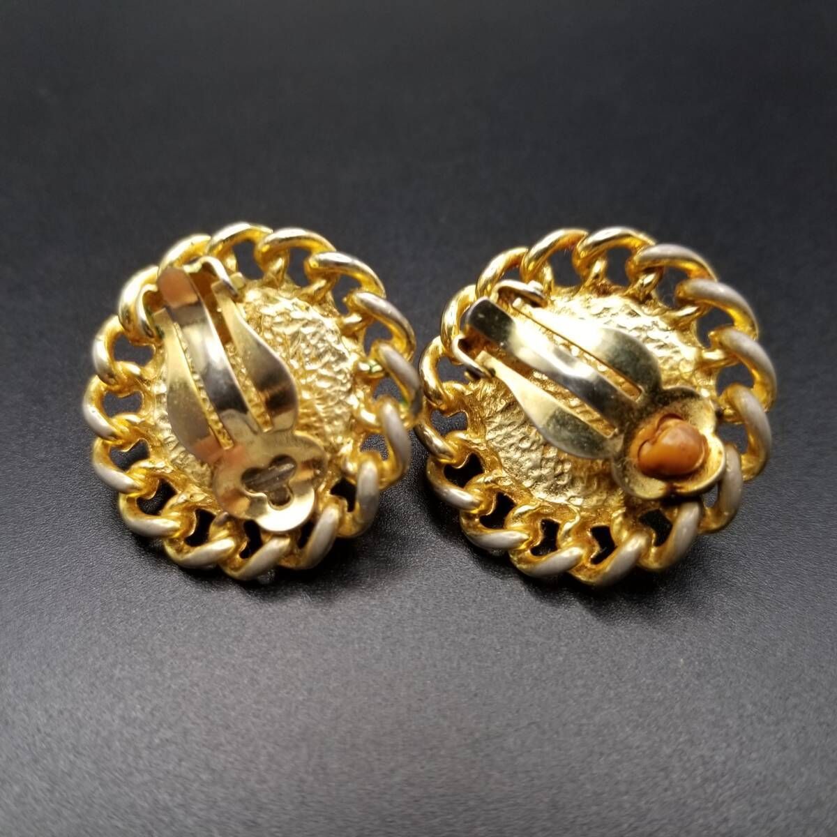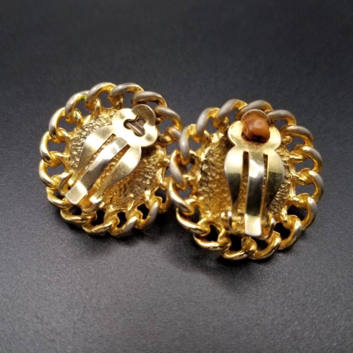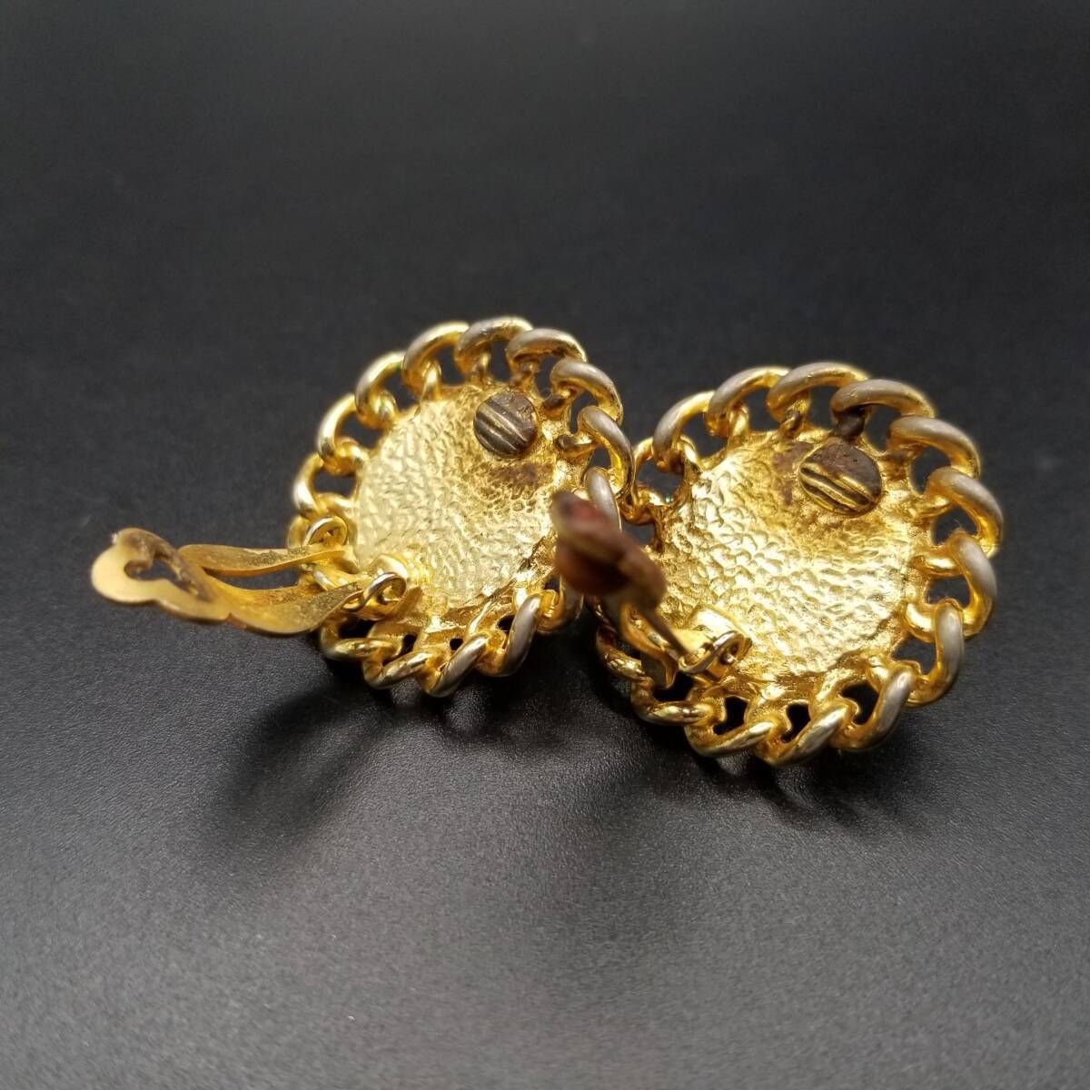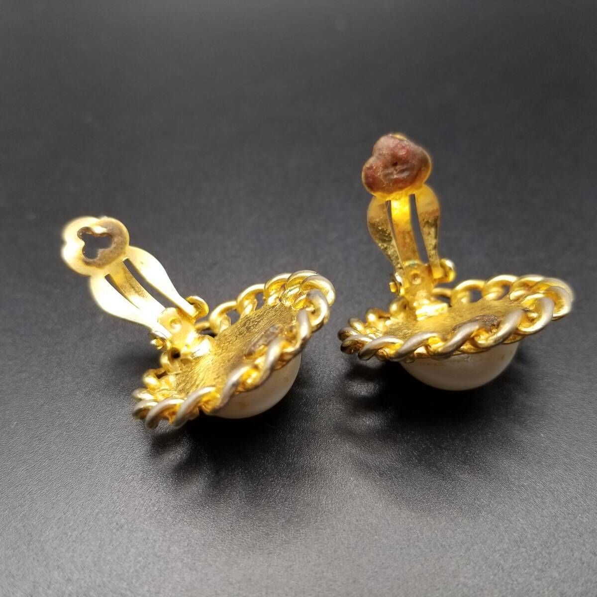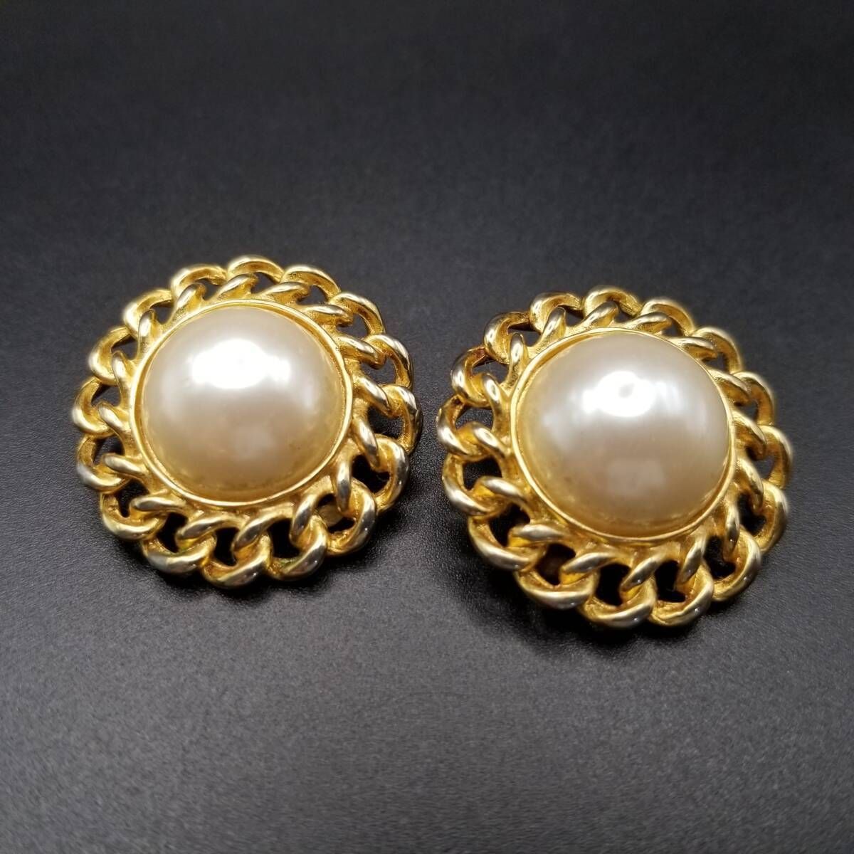 ゴールドチェーン フレーム パール 大ぶり ヴィンテージ クリップ イヤリング ラウンド レトロ ファッションジュエリー 存在感 Y18-W