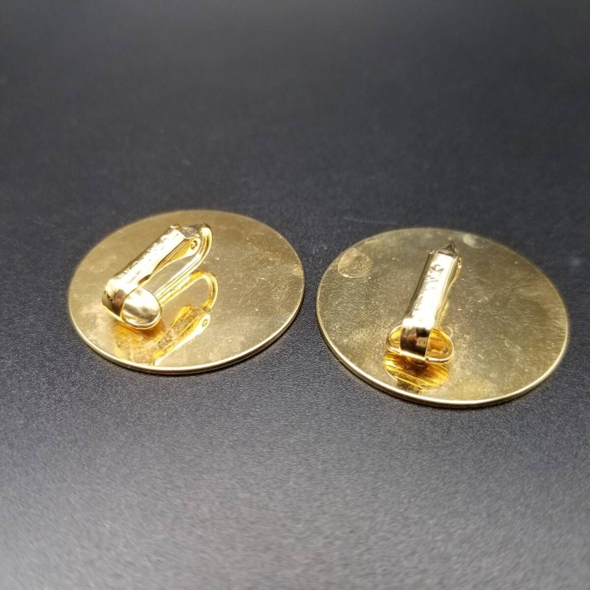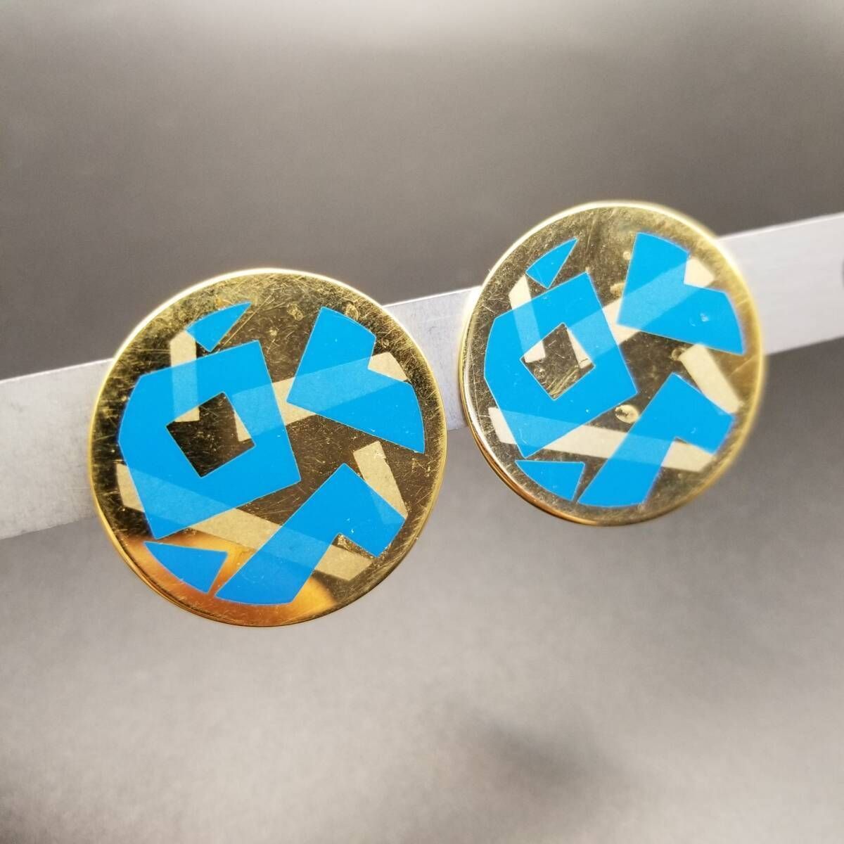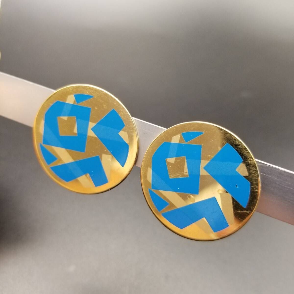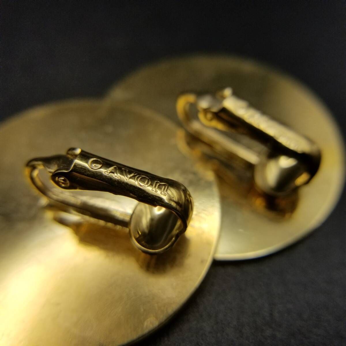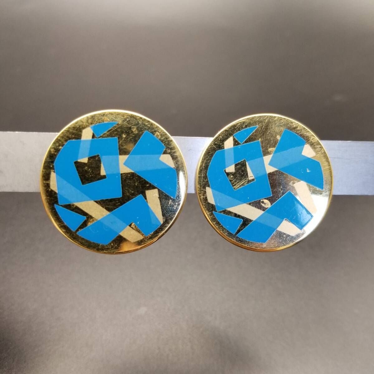 AVON モザイク柄 ブルーライン ラウンドプレート ヴィンテージ クリップイヤリング ゴールドトーン 大ぶり 存在感 Y18-W