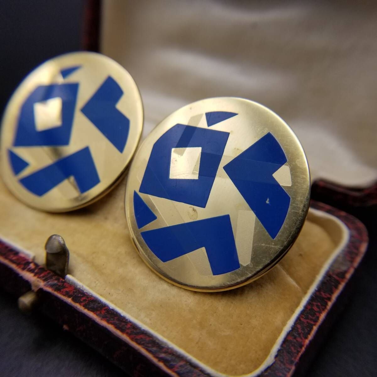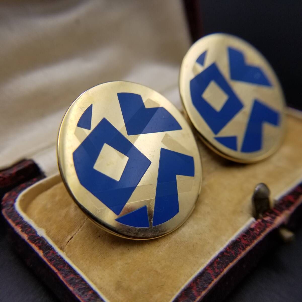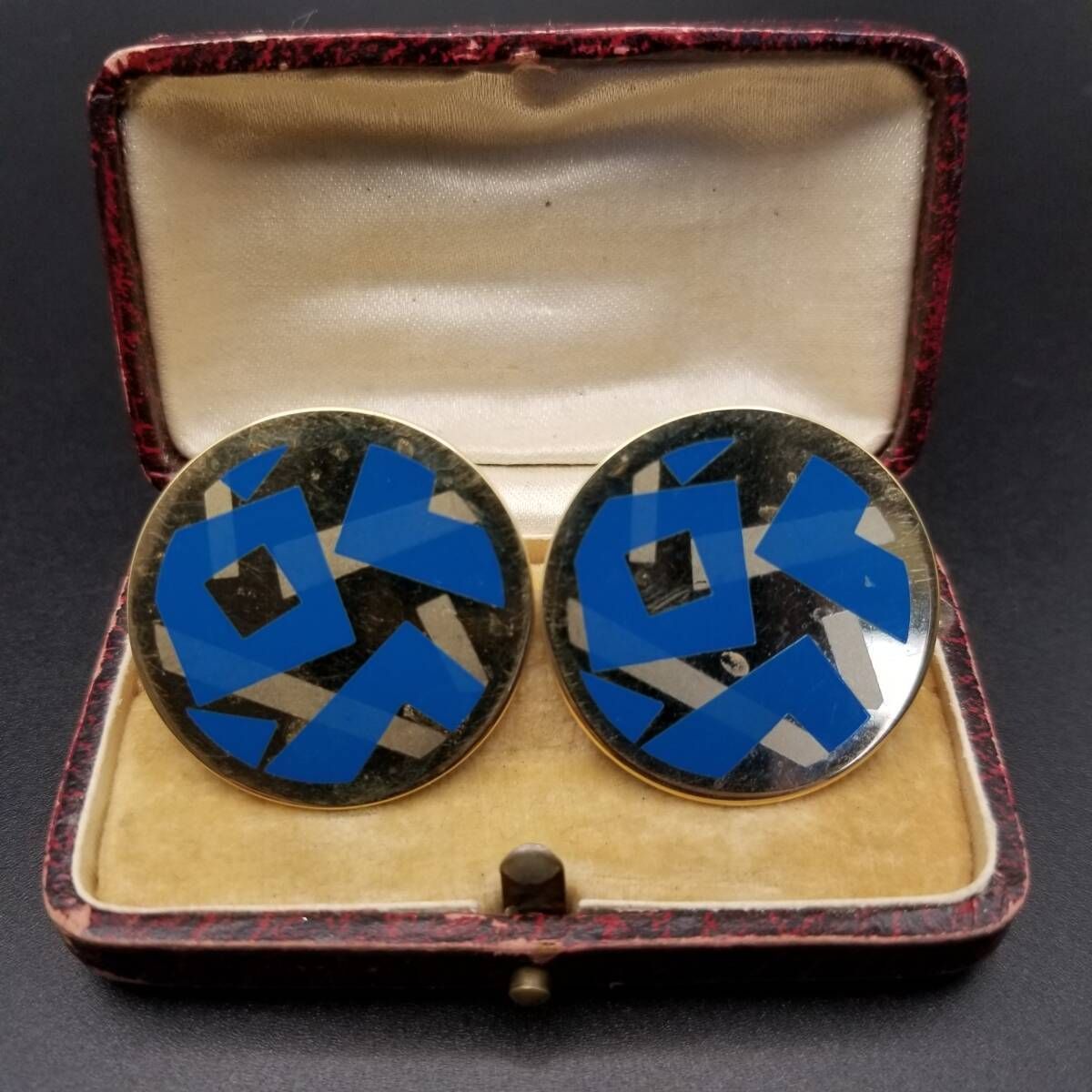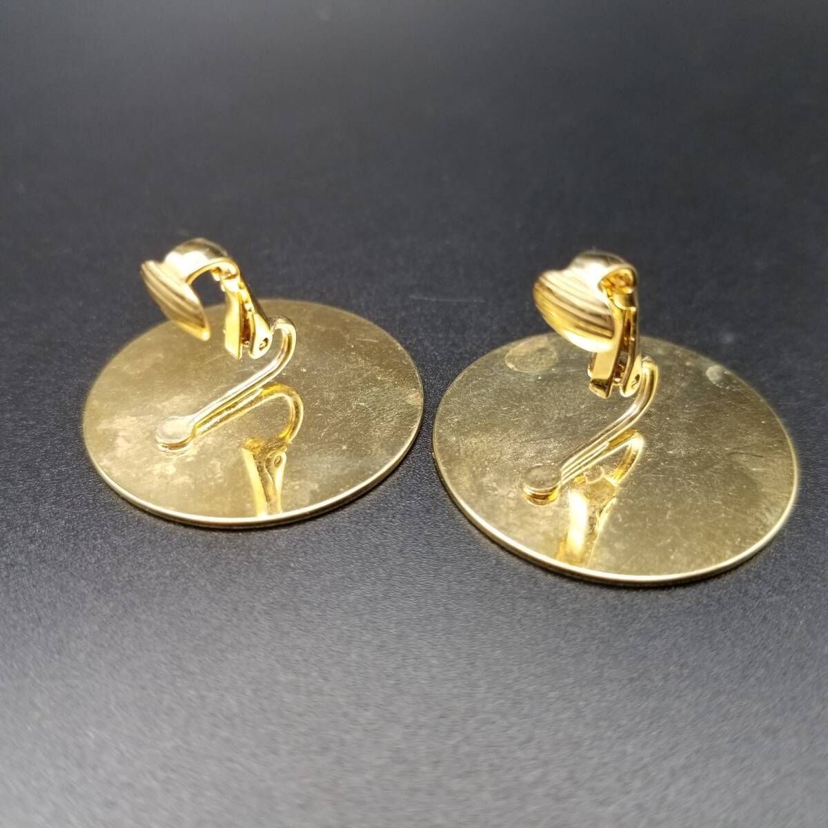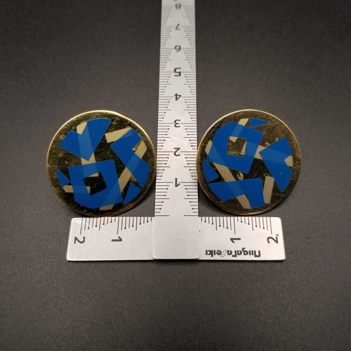 AVON モザイク柄 ブルーライン ラウンドプレート ヴィンテージ クリップイヤリング ゴールドトーン 大ぶり 存在感 Y18-W