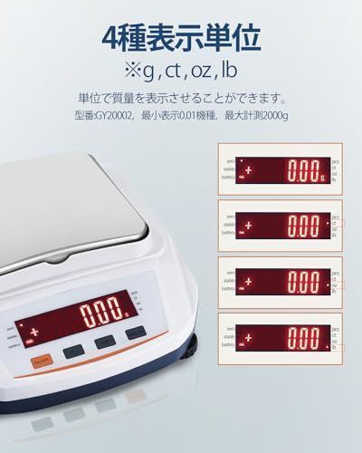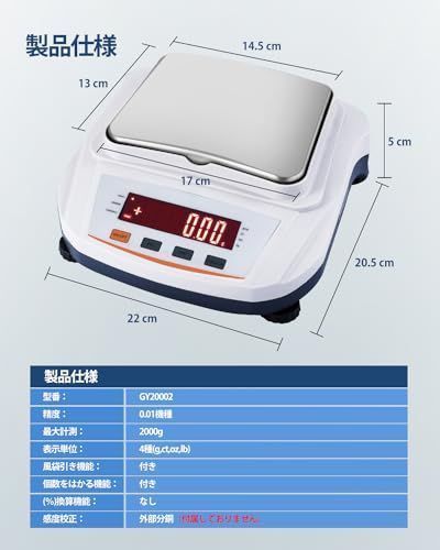【仕様】:型番GY20002、精度0.01機種、最大計測2000g。感度校正:外部分銅(分銅付属しておりません)。充電式ではありません。ご注意:ご使用する前に、皿の裏面の保護フィルムを剥しください。