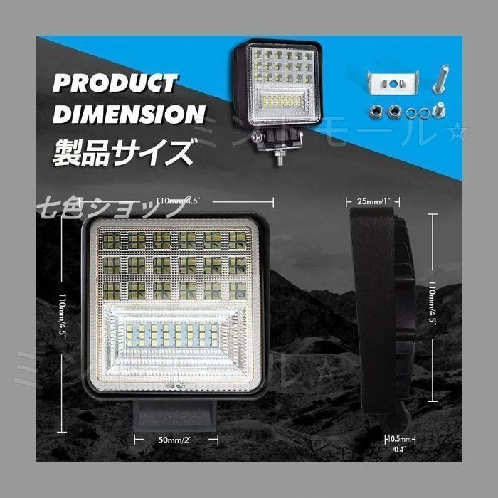 製品仕様:11(L)x11(W)x3(H)CM。LED電力:126W。色温度:6000K-6500K、ホワイト発光。全光束:?8800LM。