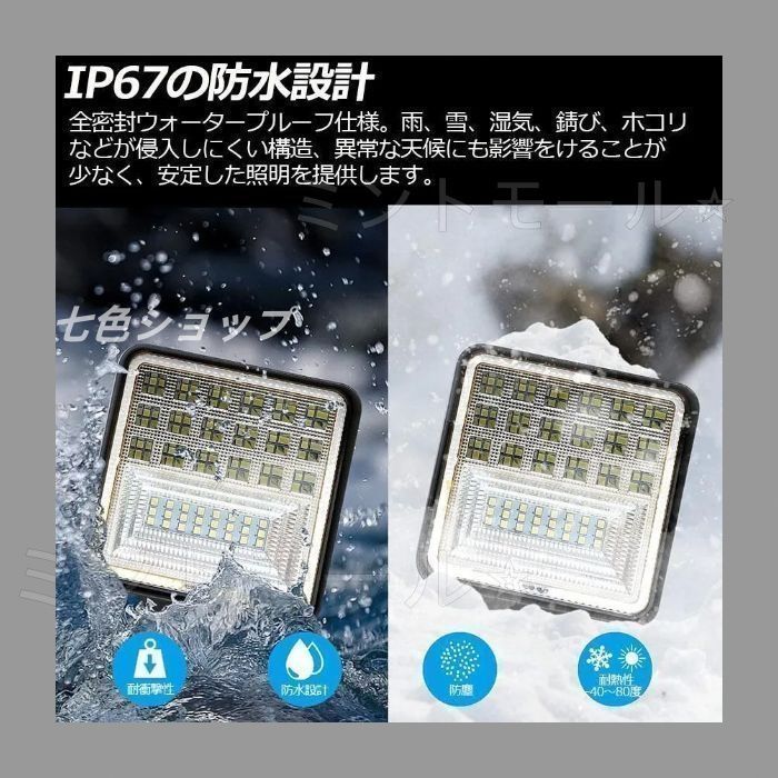 性能:IP67レベル全密封ウォータープルーフ仕様。雨、雪、湿気、錆び、ホコリなどが侵入しにくい構造、異常な天候にも影響をけることが少なく、安定した照明を提供します。