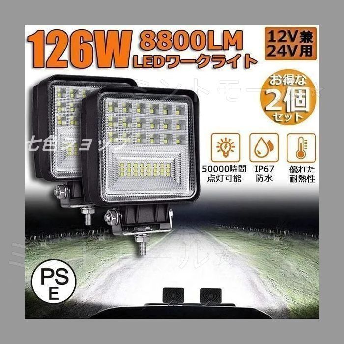 高輝度LED作業灯 2個セット 126W 12V/24V兼用 完全防水防塵 防震設計 自由取付け 省エネ デッキライト ワークライト 工事現場 倉庫 駐車場