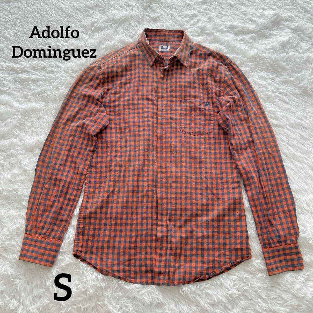 Adolfo Dominguez 長袖シャツ チェック 隠しボタン 革ラベル S