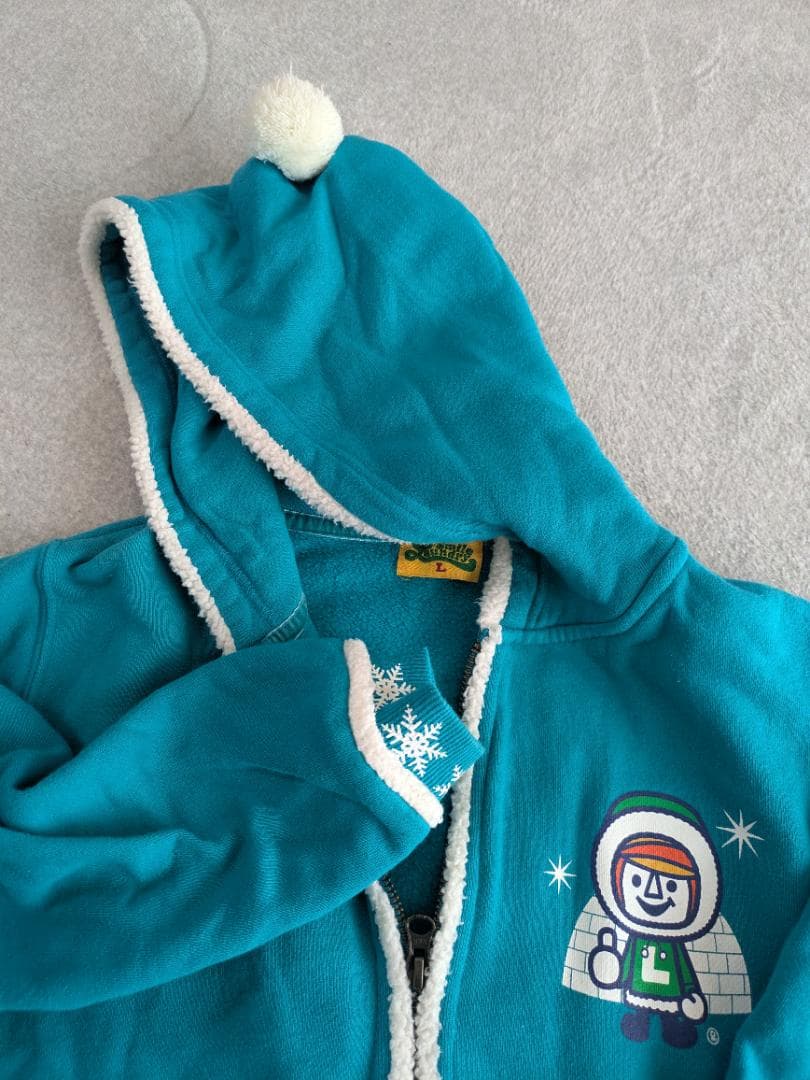 ターコイズ色のフリースパーカー、雪の結晶とキャラクターのデザイン。 - 色: ターコイズ - デザイン: 雪の結晶とキャラクターのプリント - フード: ポンポン付きフード - 素材: 柔らかい生地 - 装飾: フリースの裏地 ご覧いただきありがとうございます。 性別...女の子 性別...女の子