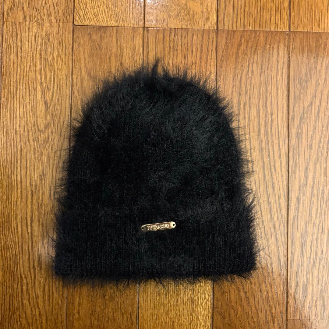 ファー ニット帽 ビーニー 黒 ゴールドパッチ 韓国 Y2K