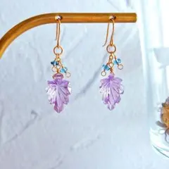 ピンクアメジスト リーフカービング ロンドンブルートパーズ ピアス 14kgf