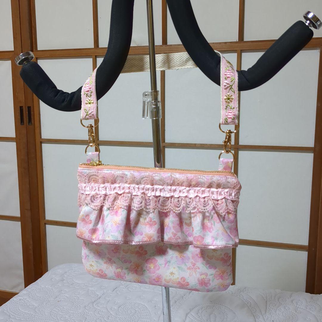 専用…フリル持ち手付きペタンコポーチ…リバティ シンクオブミーチェリーブロッサム