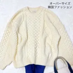【極美品】アランフィッシャーマンニット ケーブル編肉厚ウールアイボリーF手洗い可
