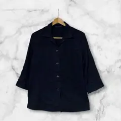 リボン付きボウタイシャツ ブラウス 半袖 ステッチ デザイン ブルー M