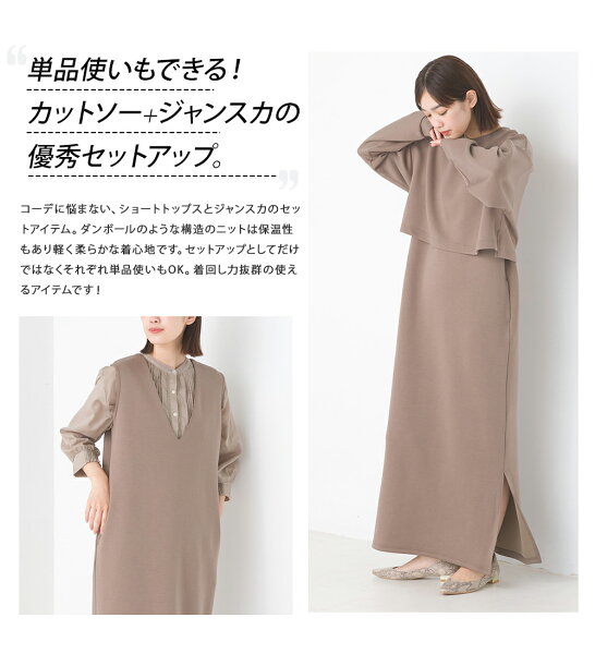 【hbB】【OMNES】ダンボールニット ショートプルオーバー Vネックジャンスカセット レディース フリーサイズ 長袖 セットアップ カジュアル ロングワンピース HAPTIC ハプティック