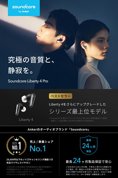 Anker Soundcore Liberty 4 Pro(Bluetooth 5.3)【カナル型完全ワイヤレスイヤホン/ウルトラノイズキャンセリング 3.5 / A.C.A.A 4.0 / ハイレゾ/感圧 & スワイプセンサー搭載/PSE技術基準適合】