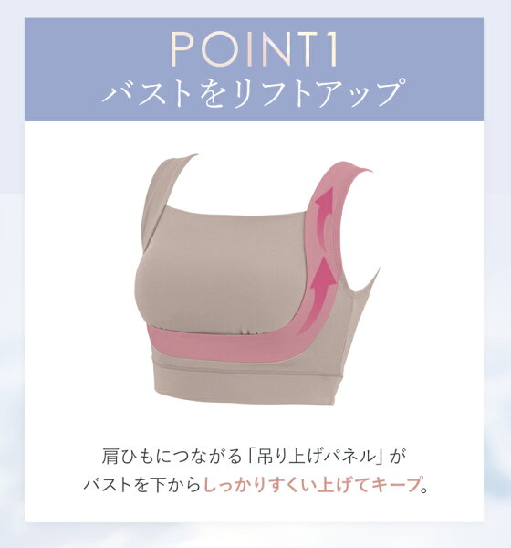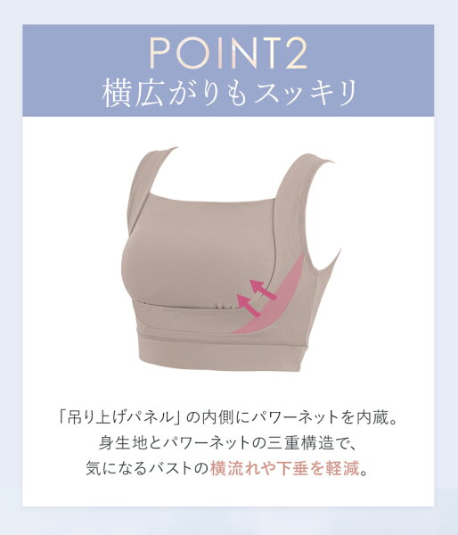 バスト周りに施した吊り上げパネルがバストを下からしっかりとすくい上げて保ち、脇に流れるお肉も内側へ寄せてサイドもすっきりと整えます。