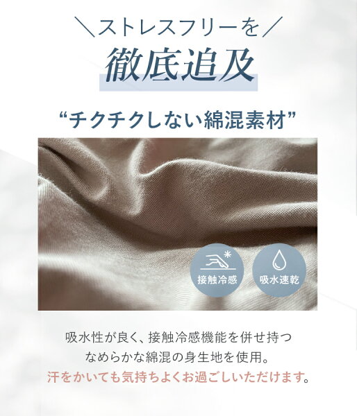 吸水性が良く、接触冷感機能を併せ持つなめらかな綿混の身生地を使用しているため、汗をかいても気持ちよくお過ごしいただけます。